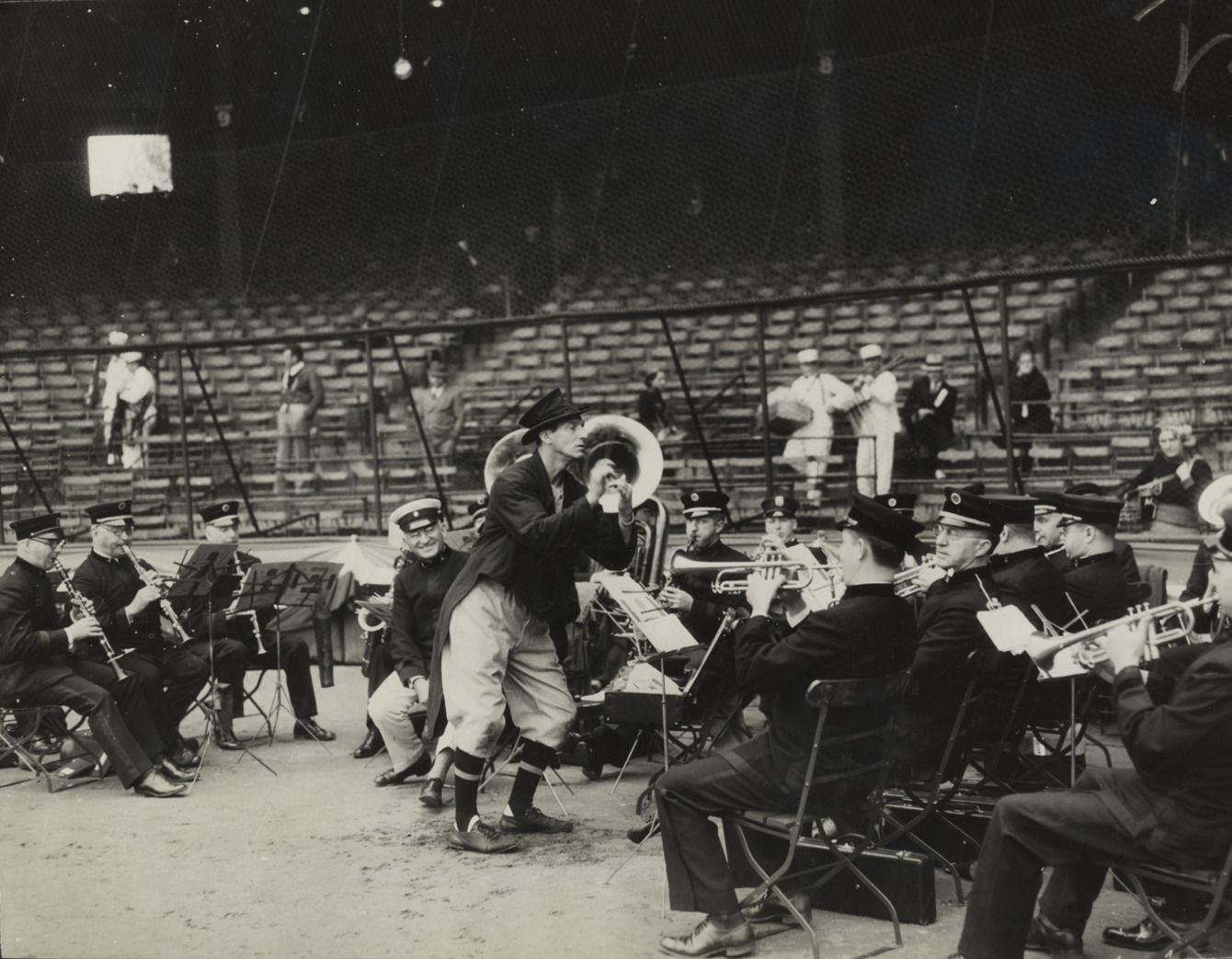 Favorite this☆ Al Schacht directing band Description: View of baseball clown Al Schacht directing band at 1934 World Series. Several spectators watch from grandstand. Typed on label: "World Series, 1934, Al Schacht directing band." Details Resource ID: hr004804 Subject: Schacht, Al (Alexander), b. 1894 Clowns Bands (Music) World Series (Baseball) (1934) Photographic prints Date Issued: 1934 Format: 1 photographic print mounted on stock ; image 7 x 9 in. Member of: Ernie Harwell Sports Collection Filing Location: Oversize SB/Photographs-World Series, 1932-1934 Note (Content): Photograph from scrapbook of World Series, 1932-1934 Rights: Physical rights are retained by DPL. Copyright is retained in accordance with U.S. copyright laws.