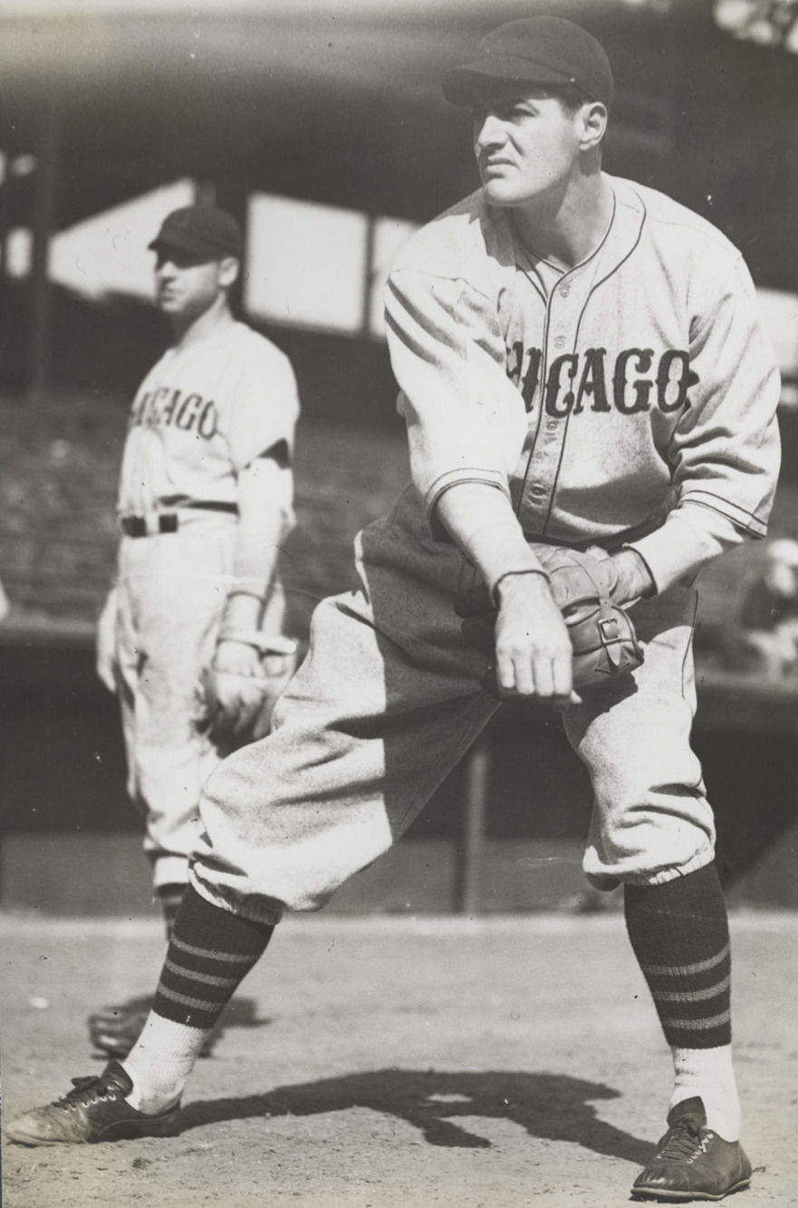 Portrait of Bill Lee, baseball player for the Chicago Cubs. Another player stands in background. Typed on label: "William C. Lee, Cubs, 1935."