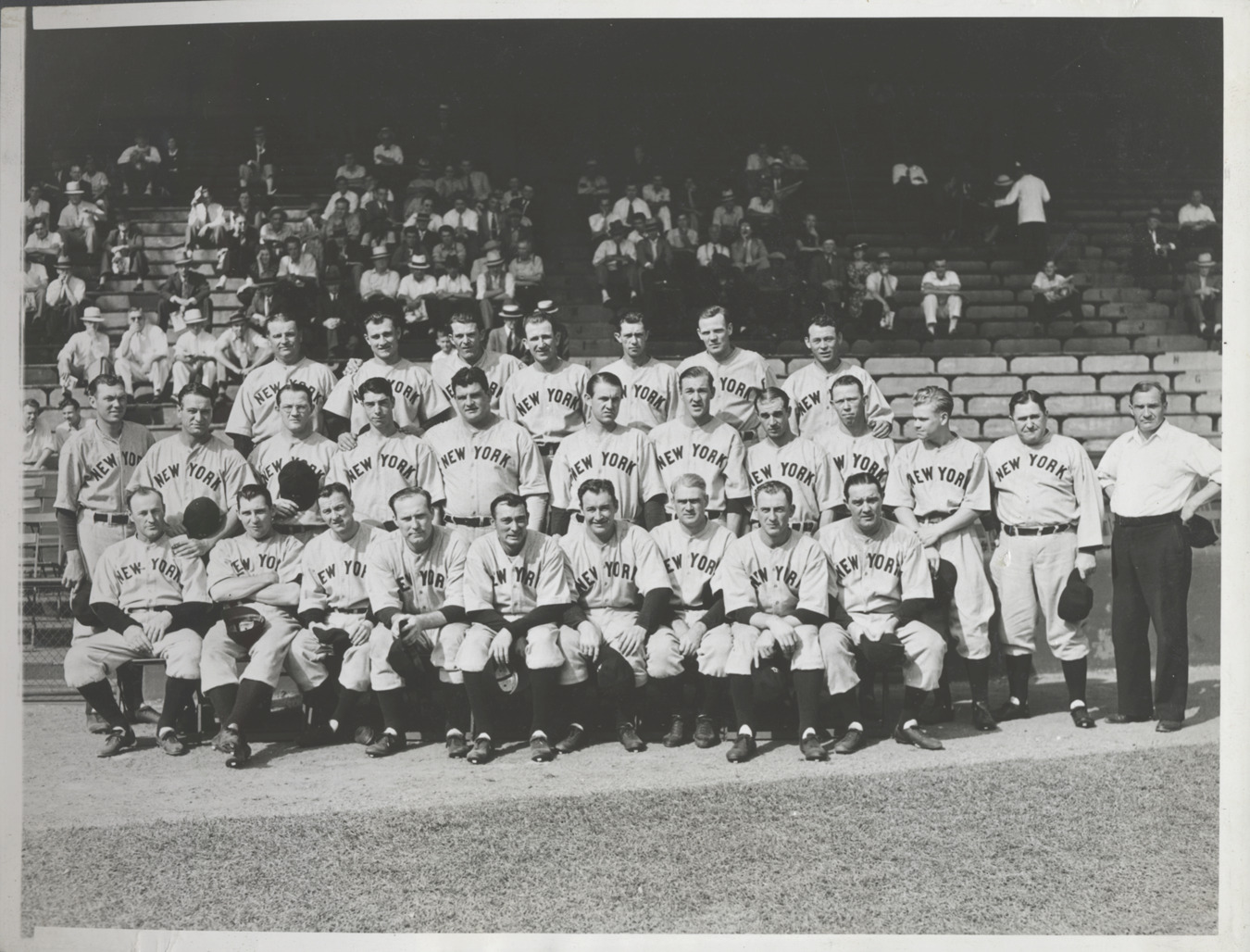 Group portrait of 1936 New York Yankees, posing in front of grandstand. Typed on label: "New York 'Yankees', A.L. World Champions, 1936. Left to right, front row: Coach Fletcher; Glenn; Pearson; Rugging; Lazzeri; Hadley; Coach Coombs; Wicker; Malone. Second row: Dickey; Gehrig; Broaca; DiMaggio; Brown; Gomez; Murphy; Crosetti; Seeds; Hart; Joe McCarthy, manager; Earle Painter, trainer. Top row: Coach Schulte; Powell; Selkirk; Jorgens; Saltzgaver; Rolfe; Johnson."