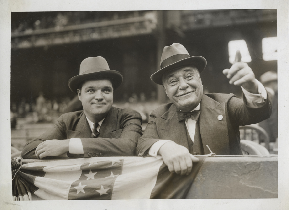 Favorite this☆ Horace Stoneham and Jacob Ruppert Description: Portrait of Horace Stoneham, owner of the New York Giants and Jacob Ruppert, owner of the New York Yankees. Typed on label: "New York club owners. Horace Stoneman [sic], Giants and Col. Jacob Ruppert, Yankees." Details Resource ID: hr004907 Subject: Stoneham, Horace Charles, 1903-1990 Ruppert, Jacob, 1867-1939 New York Giants (Baseball team) New York Yankees (Baseball team) Baseball team owners World Series (Baseball) (1936) Photographic prints Date Issued: 1936 Format: 1 photographic print mounted on stock ; image 6 x 8.25 in. Member of: Ernie Harwell Sports Collection Filing Location: Oversize SB/Photographs-World Series, 1935-1937 Note (Content): Photograph from scrapbook of World Series, 1935-1937 Rights: Physical rights are retained by DPL. Copyright is retained in accordance with U.S. copyright laws.