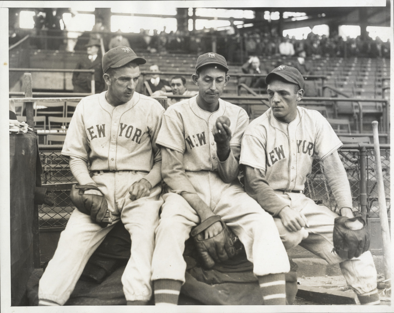Favorite this☆ Carl Hubbell, Cliff Melton and Hal Schumacher Description: View of New York Giants pitchers Carl Hubbell, Cliff Melton and Hal Schumacher, seated on bench and examining a baseball. Typed on label: "New York Giants, 1937. Left to right: Hubbell, Melton and Schumacher." Details Resource ID: hr004954 Subject: Hubbell, Carl (Carl Owen), 1903-1988 Melton, Cliff (Clifford George), 1912-1986 Schumacher, Hal (Harold Henry), 1910-1993 Pitchers (Baseball)--New York (State)--New York New York Giants (Baseball team) World Series (Baseball) (1937) Photographic prints Date Issued: 1937 Format: 1 photographic print mounted on stock ; image 7.25 x 9 in. Member of: Ernie Harwell Sports Collection Filing Location: Oversize SB/Photographs-World Series, 1935-1937 Note (Content): Photograph from scrapbook of World Series, 1935-1937 Rights: Physical rights are retained by DPL. Copyright is retained in accordance with U.S. copyright laws.
