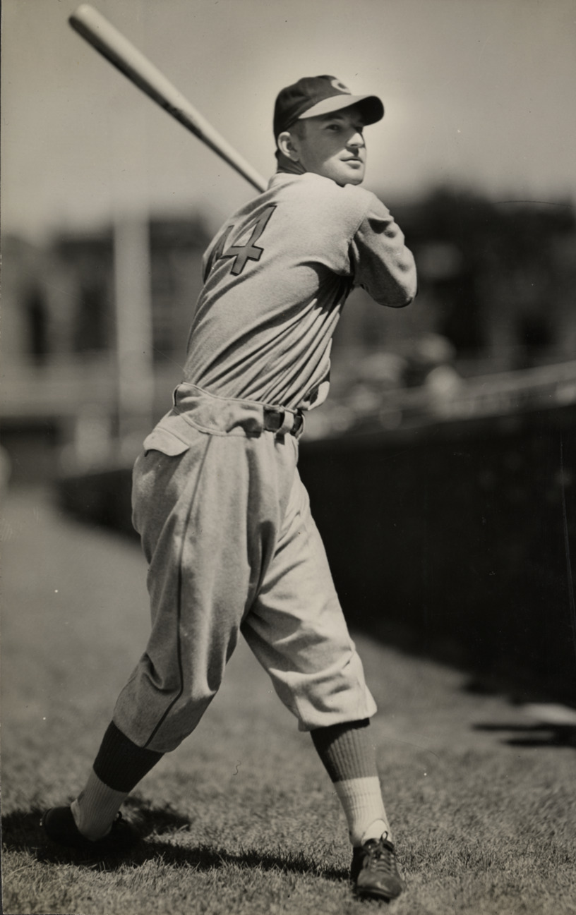 Portrait of Harry Craft, baseball player for the Cincinnati Reds, swinging a baseball bat. Typed on label: "Harry Craft, Cincinnati, 1940."