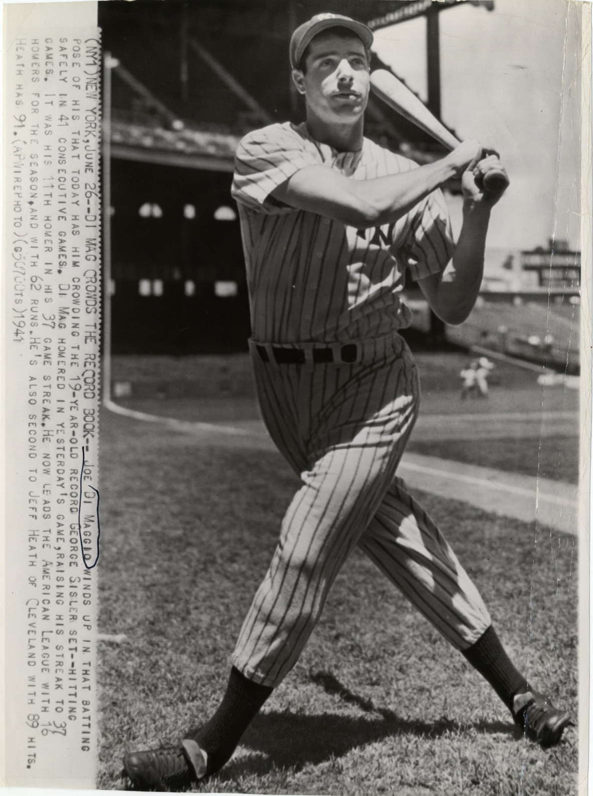 New York Yankees center fielder Joe DiMaggio batting on field. Printed on front: "(NY1) New York, June 26. Di Mag crowds the record book. Jo Di Maggio winds up in that batting pose of his that today has him crowding the 19-year-old record George Sisler set--hitting safely in 41 consecutive games. Di Mag homered in yesterday's game, raising his streak to 37 games. It was his 11th homer in his 37 game streak. He now leads the American League with 16 homers for the season, and with 62 runs. He's also second to Jeff Heath of Cleveland with 89 hits. Heath has 91. (APWirephoto) (G50700TS) 1941."