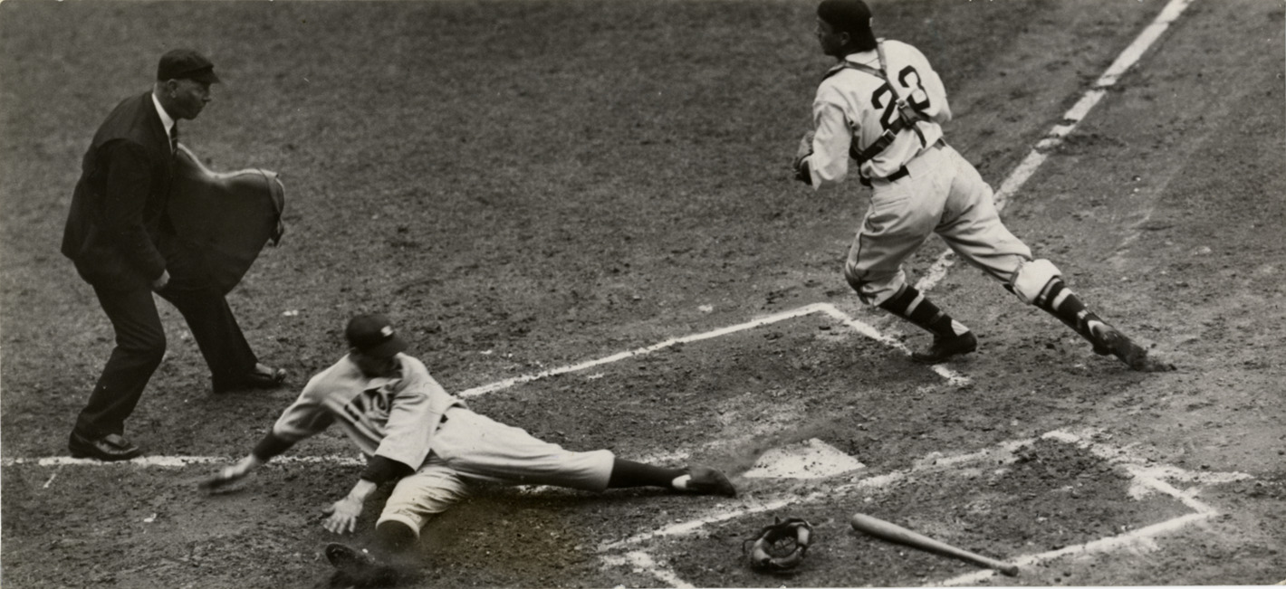 Favorite this☆ Joe DiMaggio Description: New York Yankees center fielder Joe DiMaggio sliding home. Umpire and Detroit Tigers catcher watching. Stamped on back: "May 4, 1937. Nov 16, 1937." Handwritten on back: "Joe DiMaggio slides home against Tigers. 3rd inning." Details Resource ID: hr005065 Subject: DiMaggio, Joe, 1914-1999 Baseball players--New York (State)--New York New York Yankees (Baseball team) Detroit Tigers (Baseball team) Photographic prints Date Issued: 1937 Format: 1 photographic print ; 4.5 x 9.5 in. Member of: Ernie Harwell Sports Collection Filing Location: Photographs-Biography-DiMaggio, Joe Rights: Physical rights are retained by DPL. Copyright is retained in accordance with U.S. copyright laws.