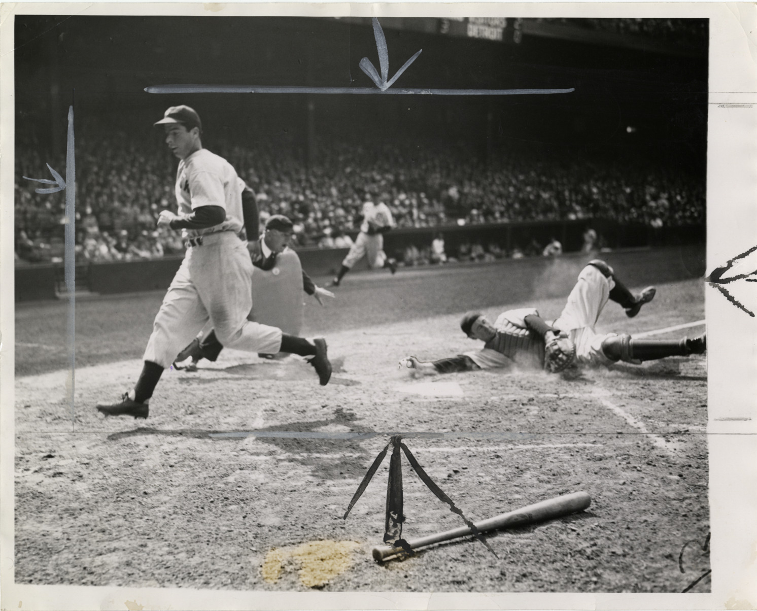 Favorite this☆ Joe DiMaggio Description: New York Yankees center fielder Joe DiMaggio crossing home plate. Umpire calling safe; catcher sliding with ball. Stamped on back: "Jun 21, 1940. Jun 22, 1940." Handwritten on back: "Joe DiMaggio safe at home. 3rd inning." Details Resource ID: hr005066 Subject: DiMaggio, Joe, 1914-1999 Baseball players--New York (State)--New York New York Yankees (Baseball team) Photographic prints Date Issued: 1940-06 Format: 1 photographic print ; 8 x 10 in. Member of: Ernie Harwell Sports Collection Filing Location: Photographs-Biography-DiMaggio, Joe Rights: Physical rights are retained by DPL. Copyright is retained in accordance with U.S. copyright laws.