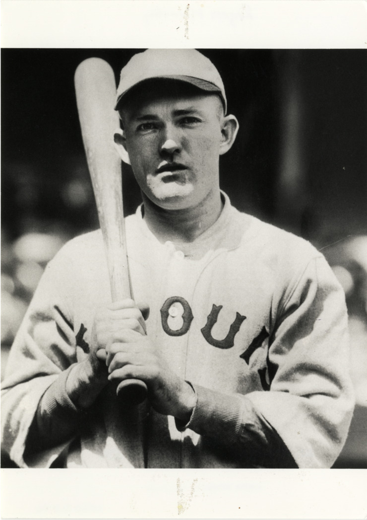 St. Louis Cardinals infielder Rogers Hornsby posed with bat. Handwritten on back: "Rogers Hornsby."
