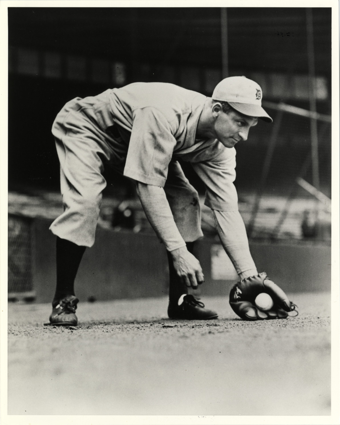 Detroit Tigers shortstop Billy Rogell posed catching grounder on field. Stamped on back: "Credit National Baseball Library, Cooperstown, N.Y. ..." Handwritten on back: "Billy Rogell. NBL."