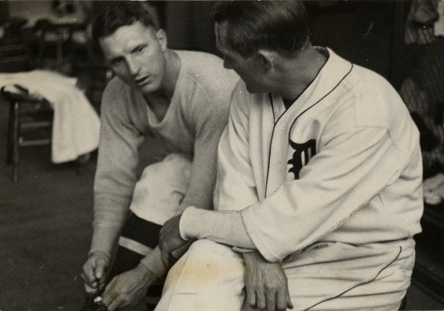 Detroit Tigers shortstop Billy Rogell with manager Del Baker, in locker room. Stamped on back: "Dec 31 1938." Handwritten on back: "Billy Rogell and Del Baker."