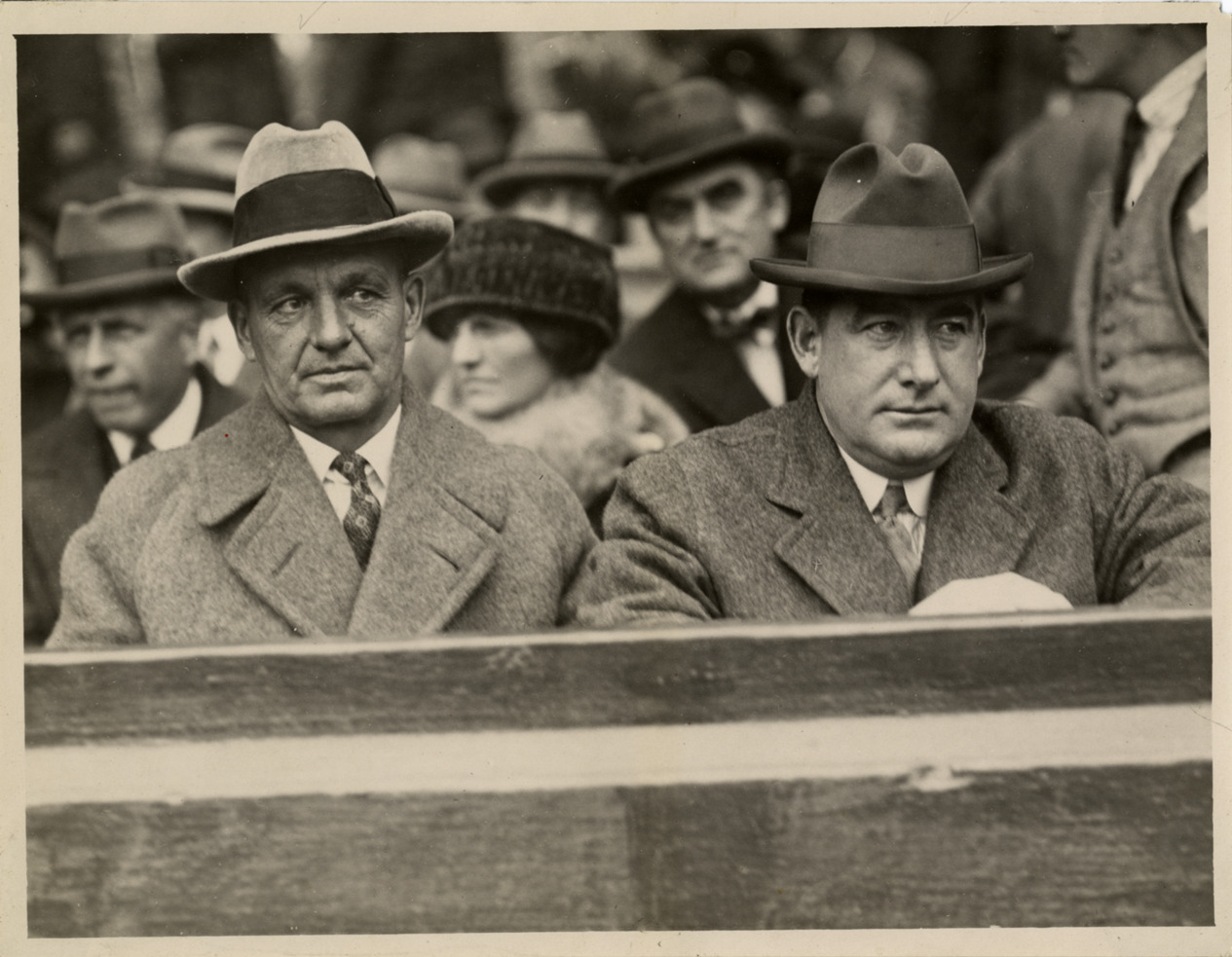 Portrait of former New York Giants baseball players Joe McGinnity and Roger Bresnahan watching 1923 World Series from grandstand. Handwritten on back: "Old Giants battery. McGinnity and Bresnahan watch Giants go down to defeat in last game of World Series, 1923."