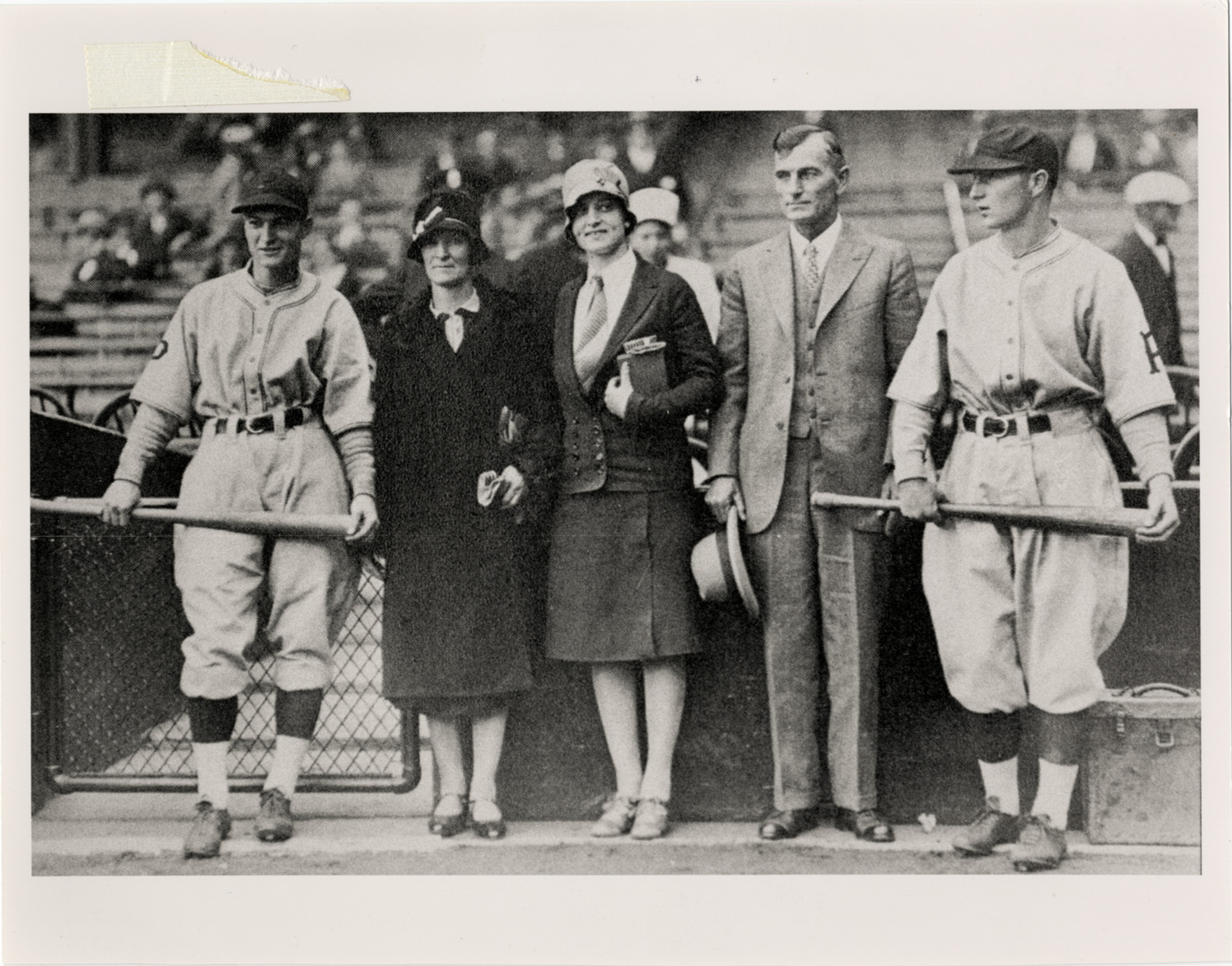 Portrait of Pittsburgh Pirates baseball players Paul and Lloyd Waner posing with family members at 1927 World Series. Handwritten on back: "Lloyd, Paul Waner family, '27 World Series."