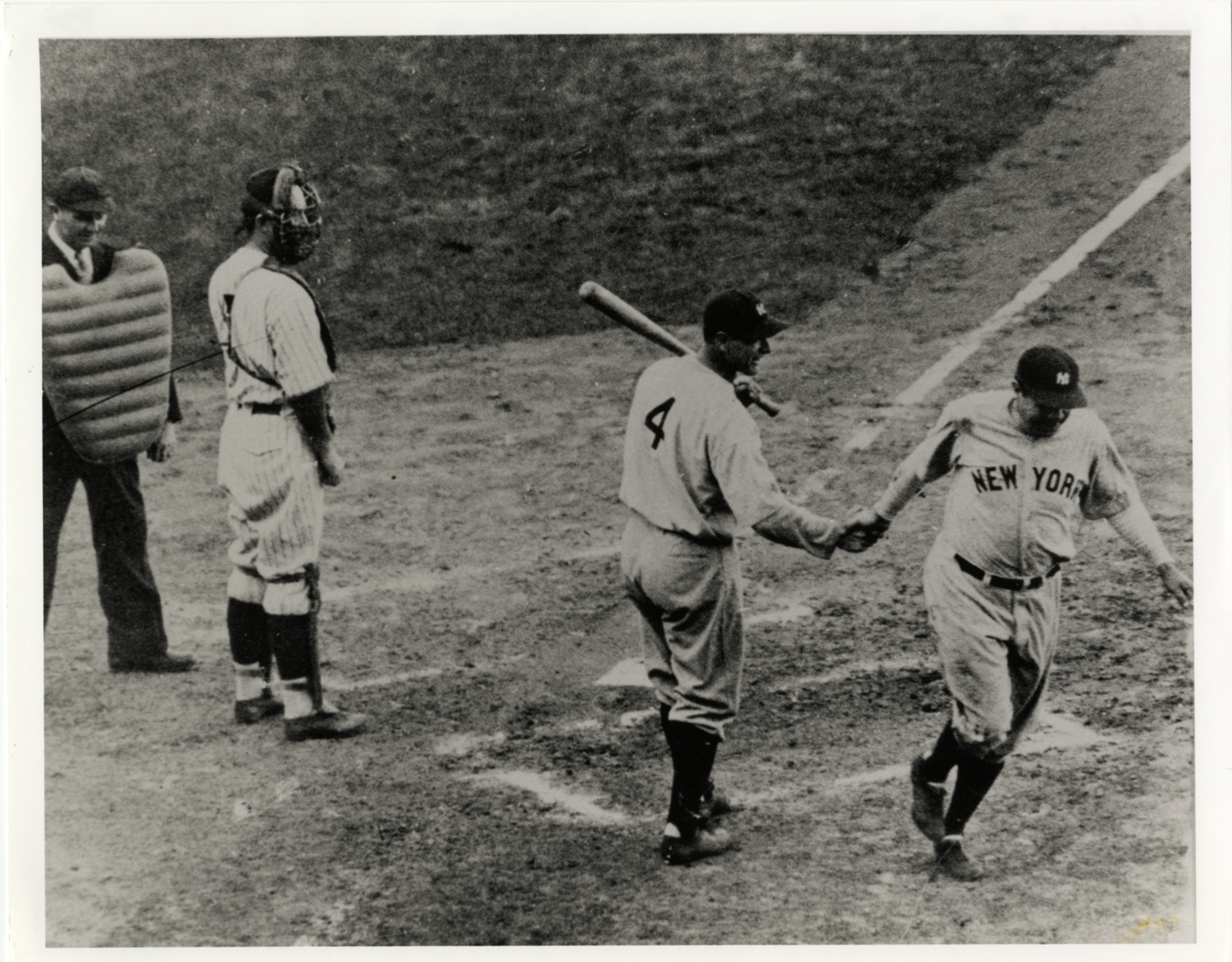 View of Lou Gehrig, holding baseball bat, shaking hands with Babe Ruth at home plate during 1932 World Series. Catcher and umpire stand nearby. Handwritten on back: "Lou Gehrig, Babe Ruth, 1932 World Series."