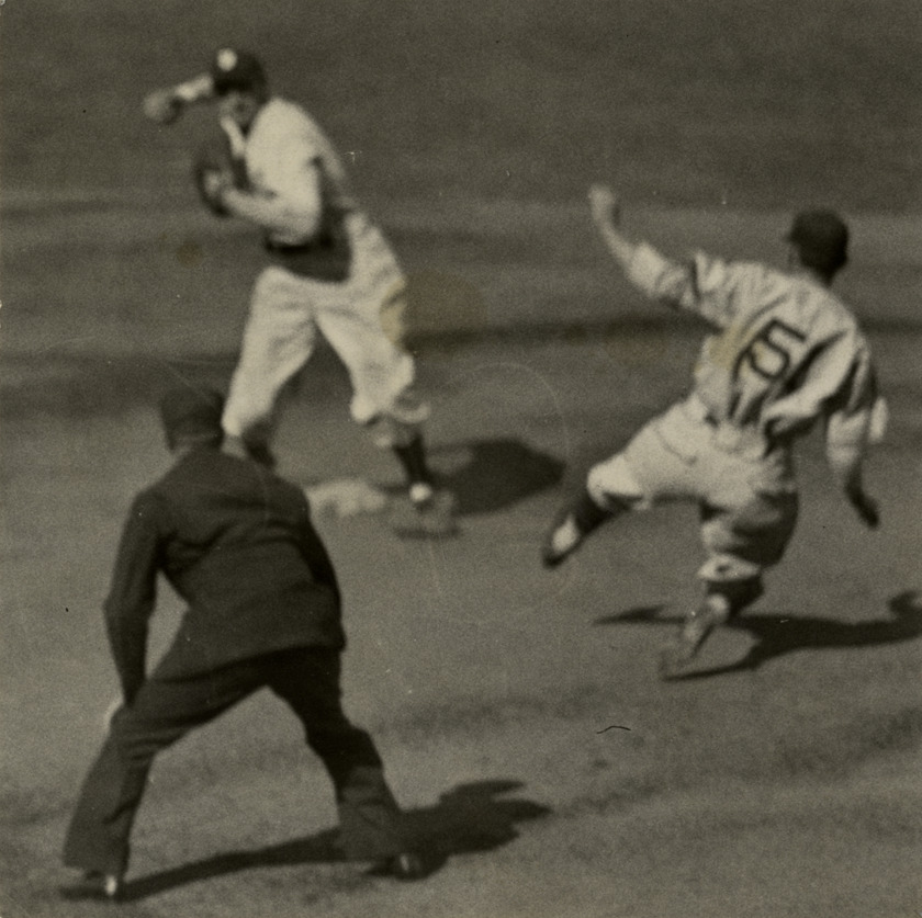 View of double play at 1935 World Series. Label on back: "The first double play of Thursday's game was executed by Bridges, Rogell and Greenberg. The photo shows Galan, left fielder for the Cubs, being forced at second, Bridges to Rogell, after he had worked Tommy for a pass to open the game. Herman, Cub [sic] baseman, started the double killing by grounding to Bridges." Handwritten on back: "2nd game, Galan out."