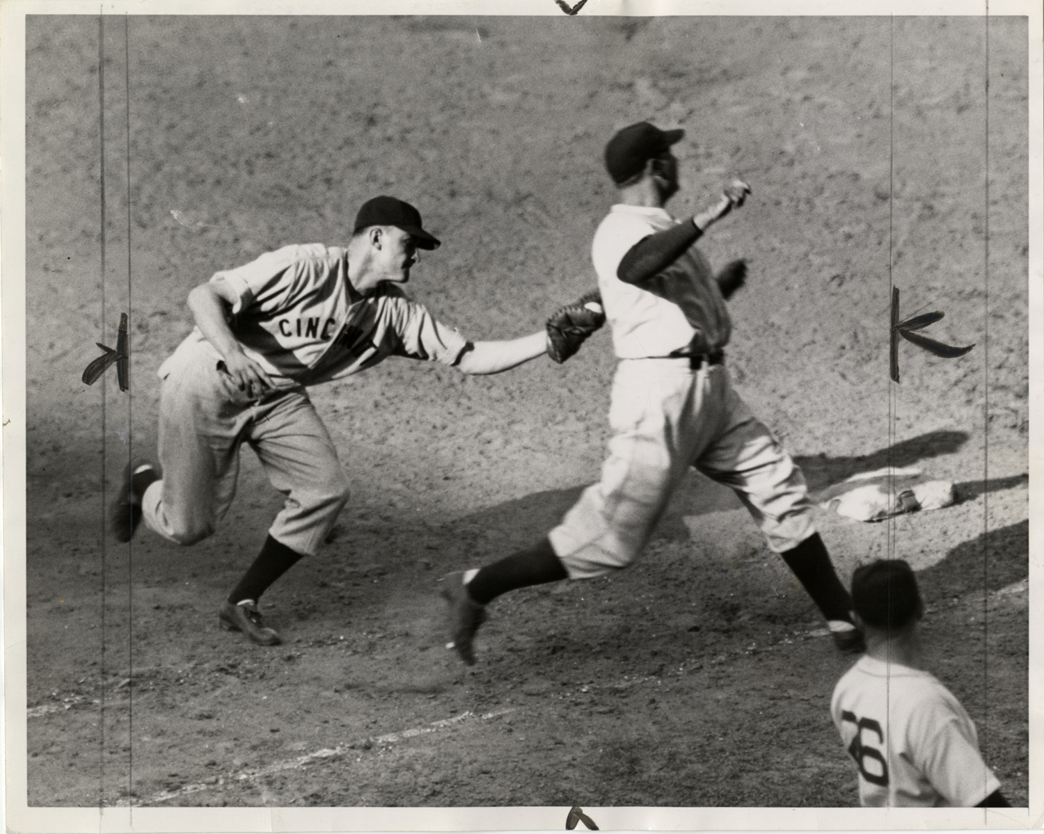 View of Detroit Tigers baseball player Rudy York being tagged by Cincinnati Reds baseball player Frank McCormick during 1940 World Series game. Label on back: "Just as one first sacker to another. Rudy York sprints for first after knocking a grounder to Billy Myers in the eighth inning, but try as he will he cannot evade Frank McCormick's stretching tag." Handwritten on back: "8th inning, 4th game, York out at 1st by McCormick."