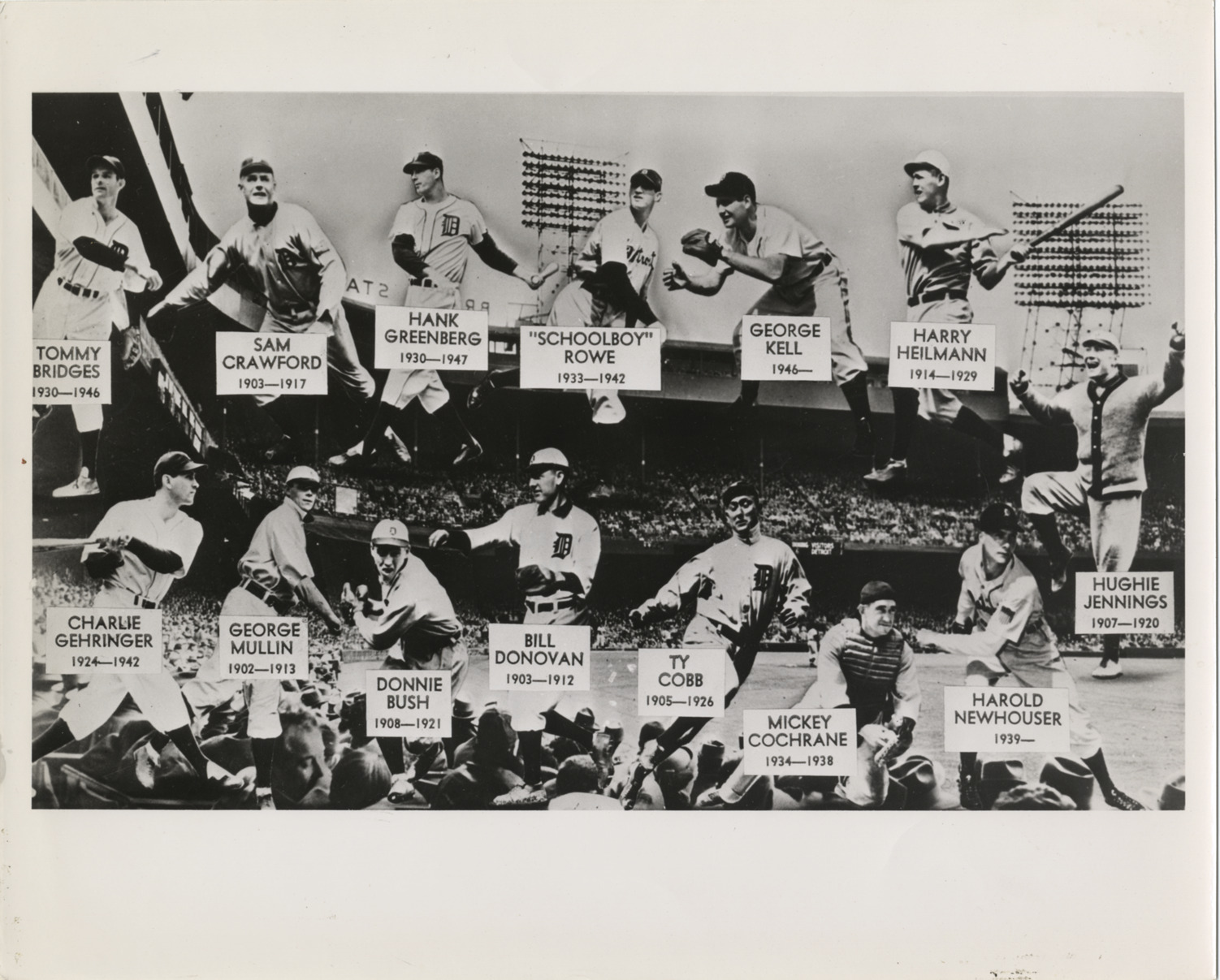 Individual portraits of Detroit Tigers baseball players superimposed over image of Briggs Stadium. Printed on front: "Tommy Bridges, 1930-1946; Sam Crawford, 1903-1917; Hank Greenberg, 1930-1947; 'Schoolboy' Rowe, 1933-1942; George Kell, 1946-; Harry Heilmann, 1914-1929; Charlie Gehringer, 1924-1942; George Mullin, 1902-1913; Donnie Bush, 1908-1921; Bill Donovan, 1903-1912; Ty Cobb, 1905-1926; Mickey Cochrane, 1934-1938; Harold Newhouser, 1939-; Hughie Jennings, 1907-1920."
