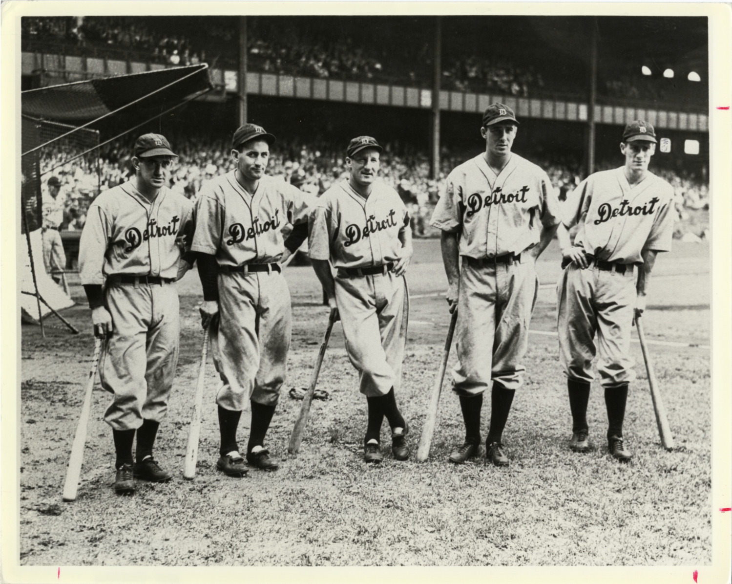 Group portrait of Mickey Cochrane, Charlie Gehringer, Goose Goslin, Hank Greenberg and Marv Owen, baseball players for the Detroit Tigers, posing with baseball bats. Label on back: "From left: Mickey Cochrane, Charlie Gehringer, Goose Goslin, Hank Greenberg, Marv Owen."