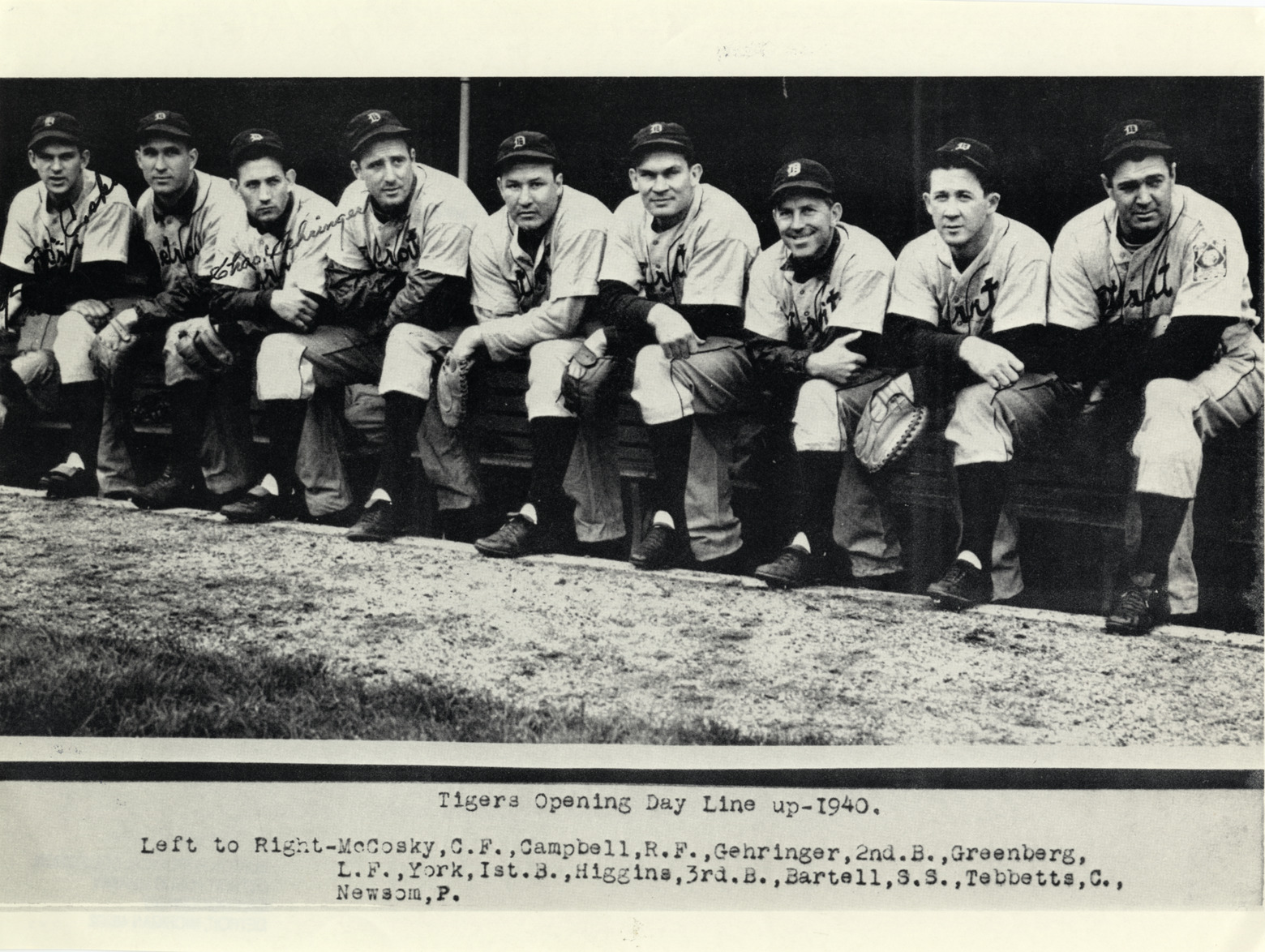 Group portrait of 1940 Detroit Tigers opening day lineup. Printed on front: "Tigers opening day line up, 1940. Left to right: McCosky, C.F.; Campbell, R.F.; Gehringer, 2nd B.; Greenberg, L.F.; York, 1st B.; Higgins, 3rd B.; Bartell, S.S.; Tebbetts, C.; Newsom, P." Handwritten on front over respective players: "McCosky, Chas. Gehringer."