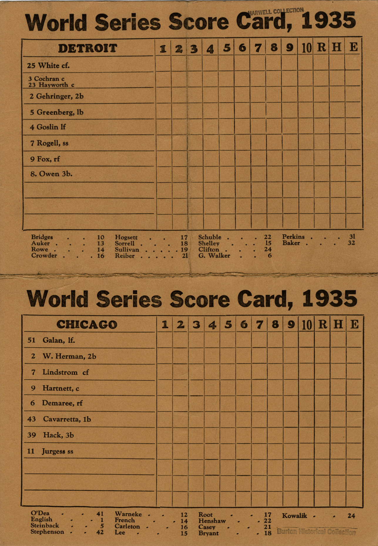 Favorite this☆ 1935 World Series baseball scorecard Description: Scorecard for 1935 World Series baseball game between Detroit Tigers and Chicago Cubs. Printed on front: "World Series score card, 1935." Details Resource ID: hr005227 Subject: Baseball--Scorekeeping World Series (Baseball) (1935) Detroit Tigers (Baseball team) Chicago Cubs (Baseball team) Advertising Date Issued: 1935 Format: 1 document : col. ; 12.5 in. Member of: Ernie Harwell Sports Collection Filing Location: Scorecards-World Series Programs, 1935 Rights: Physical rights are retained by DPL. Copyright is retained in accordance with U.S. copyright laws.