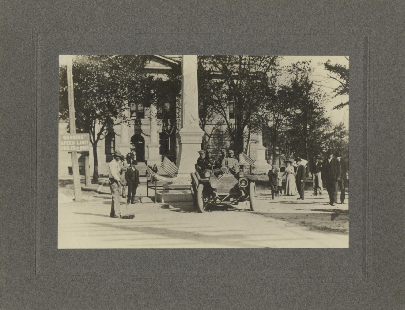 View of baseball player Ty Cobb in a Chalmers-Detroit automobile during the 1909 New York to Atlanta Good Roads Tour. Car is parked in front of monument and courthouse in Decatur, Georgia. Three passengers in car; spectators stand nearby; man with broom stands in foreground. Handwritten on back: "Decatur, Ga., 6 miles from Atlanta."