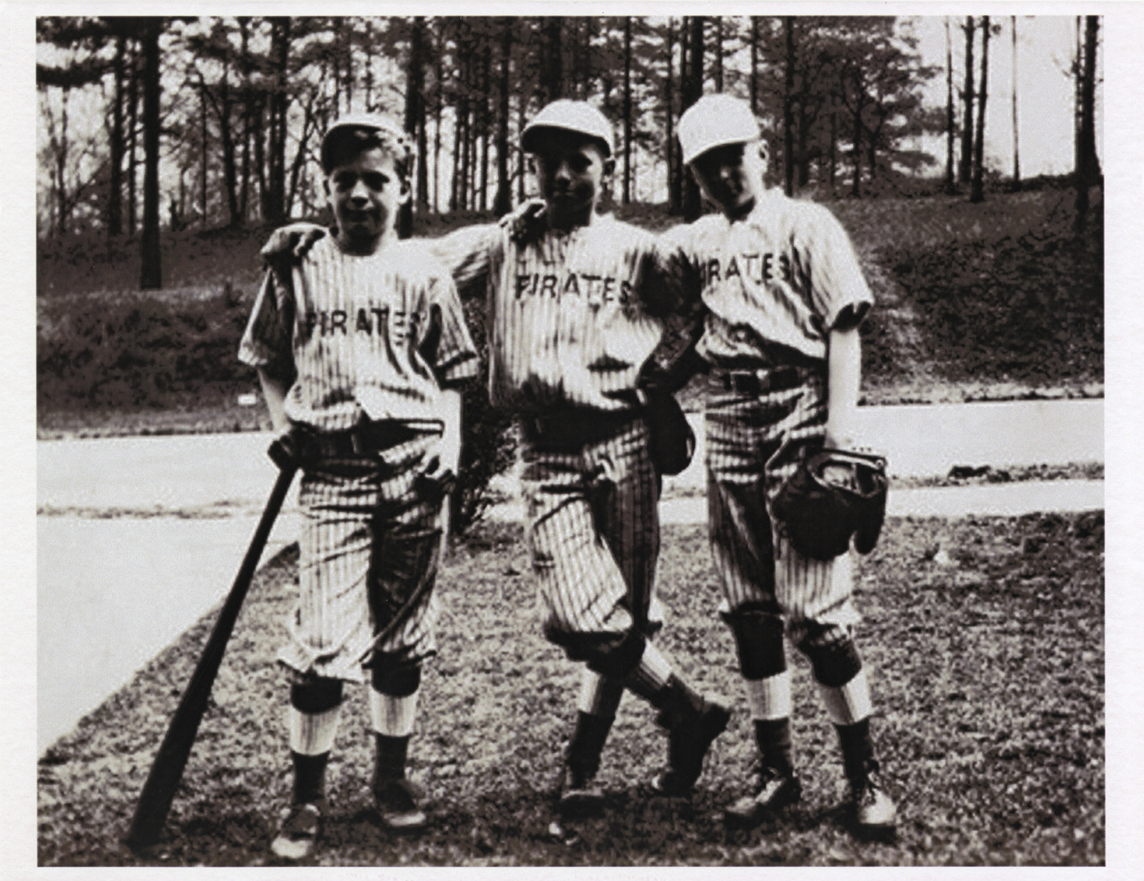Favorite this☆ Ernie Harwell and friends wearing Pittsburgh Pirates uniforms Description: View of a young Ernie Harwell and two friends wearing Pittsburgh Pirates baseball uniforms. Details Resource ID: hr005262 Subject: Harwell, Ernie--Childhood and youth Baseball uniforms Harwell, Ernie--Friends and associates Photographic prints Date Issued: Unknown year Format: 1 photographic print ; 8.5 x 11 in. Member of: Ernie Harwell Sports Collection Filing Location: Photographs-Harwell, Ernie Rights: Physical rights are retained by DPL. Copyright is retained in accordance with U.S. copyright laws.