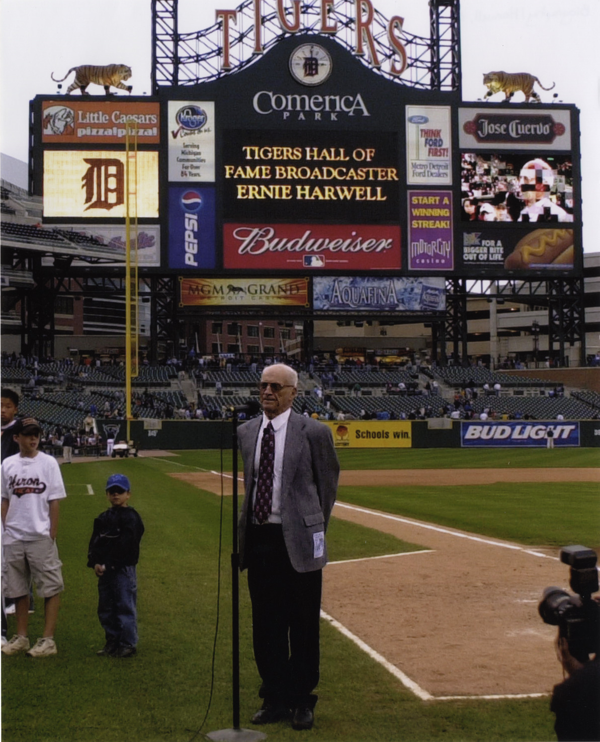 View of Ernie Harwell standing in front of microphone on field at Comerica Park. Sign in background: "Tigers, Comerica Park, Tigers Hall of Fame broadcaster, Ernie Harwell." Advertisements for Kroger, Budweiser, Little Caesars, MGM Grand, Aquafina, Ford and Jose Cuervo appear on sign. Two boys wearing baseball caps stand on left.