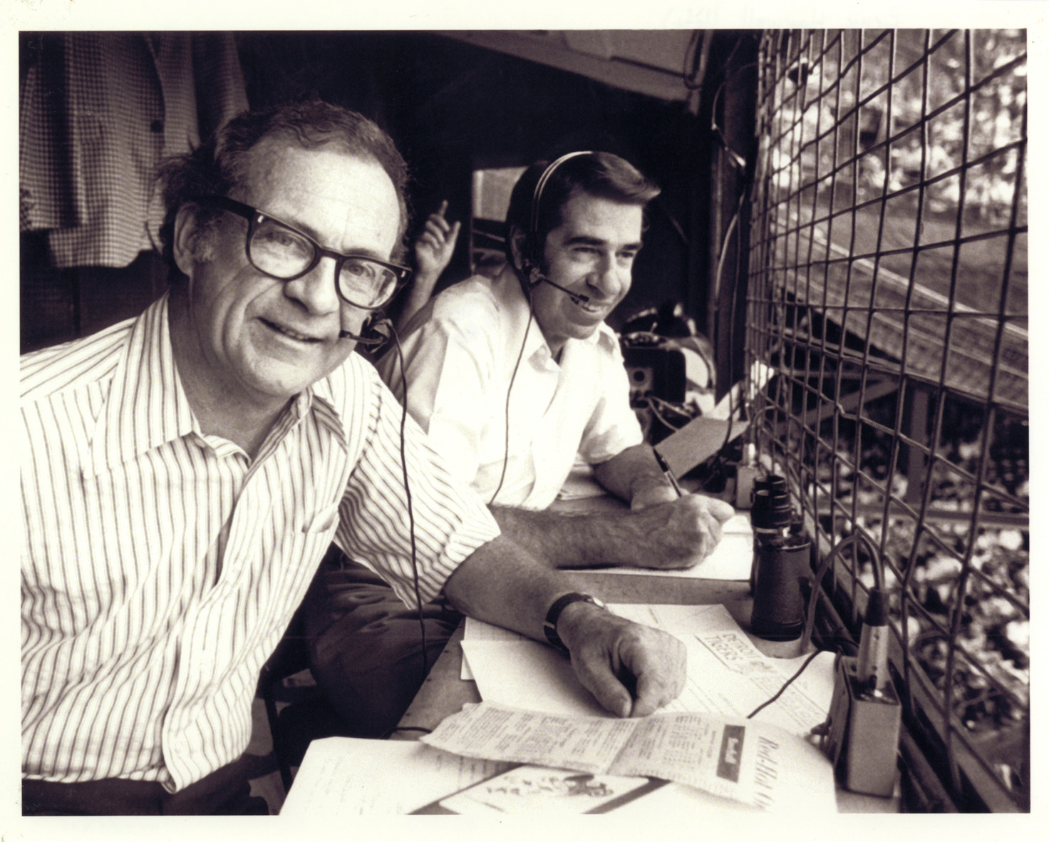 Favorite this☆ Ernie Harwell and Paul Carey Description: View of Ernie Harwell and Paul Carey in announcer's booth. Handwritten on back: "Ernie Harwell (left) & Paul Carey." Details Resource ID: hr005291 Subject: Harwell, Ernie Baseball announcers Baseball and radio Photographic prints Date Issued: Unknown year Format: 1 photographic print ; 8 x 10 in. Member of: Ernie Harwell Sports Collection Filing Location: Photographs-Harwell, Ernie Rights: Physical rights are retained by DPL. Copyright is retained in accordance with U.S. copyright laws.