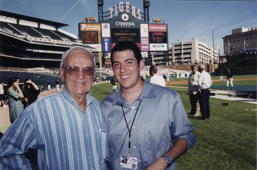 Favorite this☆ Ernie Harwell and intern Description: View of Ernie Harwell posing with intern; young man wears media identification card. Comerica Park baseball field in background. Stamped on back: "Photos by Bill Eisner, 19237 13 Mile Rd., Roseville, MI 48066." Handwritten on back: "EH & intern." Details Resource ID: hr005297 Creator: Eisner, Bill Subject: Harwell, Ernie Interns--Michigan--Detroit Photographers--Michigan--Roseville Photographic prints Date Issued: Unknown year Format: 1 photographic print : col. ; 4 x 6 in. Member of: Ernie Harwell Sports Collection Filing Location: Photographs-Harwell, Ernie Rights: Physical rights are retained by DPL. Copyright is retained in accordance with U.S. copyright laws.
