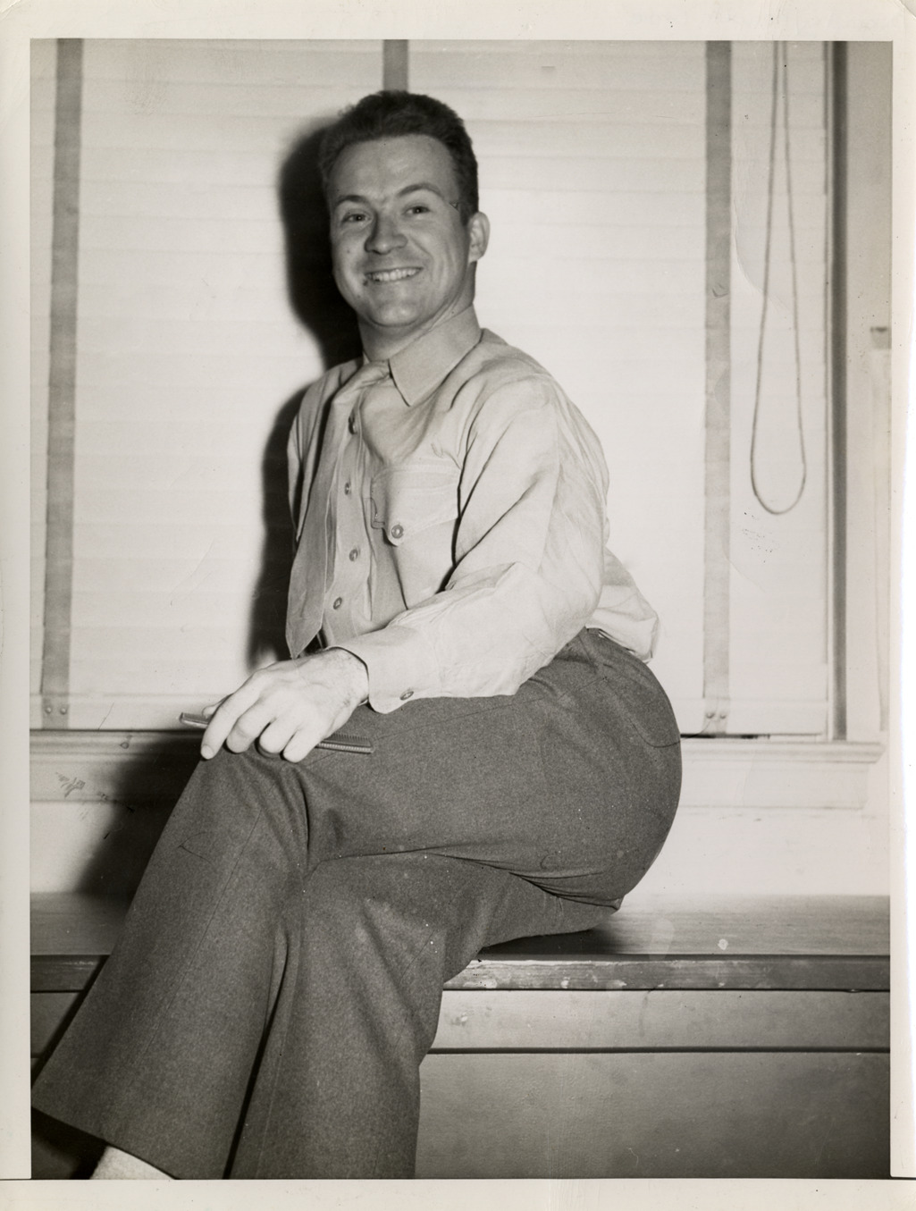Portrait of Ernie Harwell, seated on windowseat.