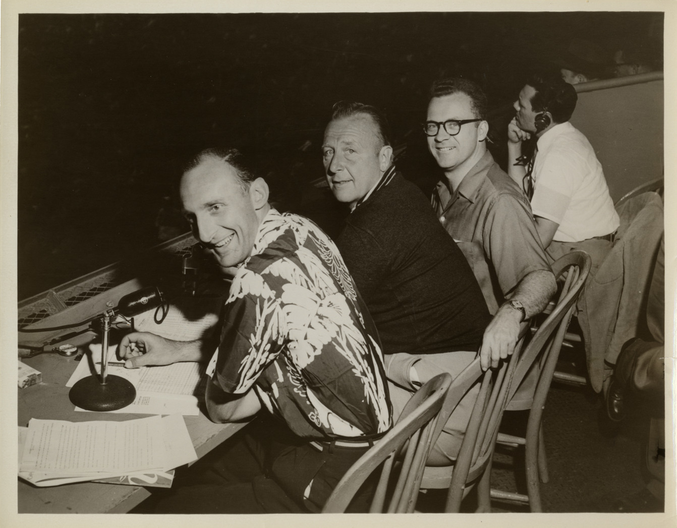View of Ernie Harwell, Chuck Thompson and Bailey Goss seated in announcer's booth. Man wearing headphones in background. Handwritten on back: "L.R. Chuck Thompson, Bailey Goss, Ernie."