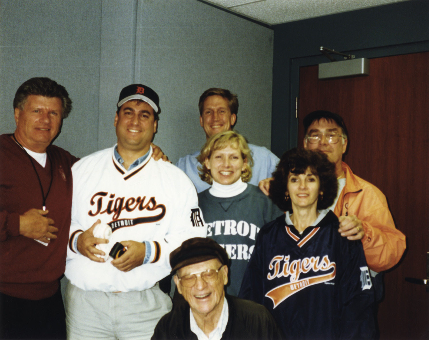 View of Ernie Harwell posing with group of men and women; some wear Detroit Tigers shirts.