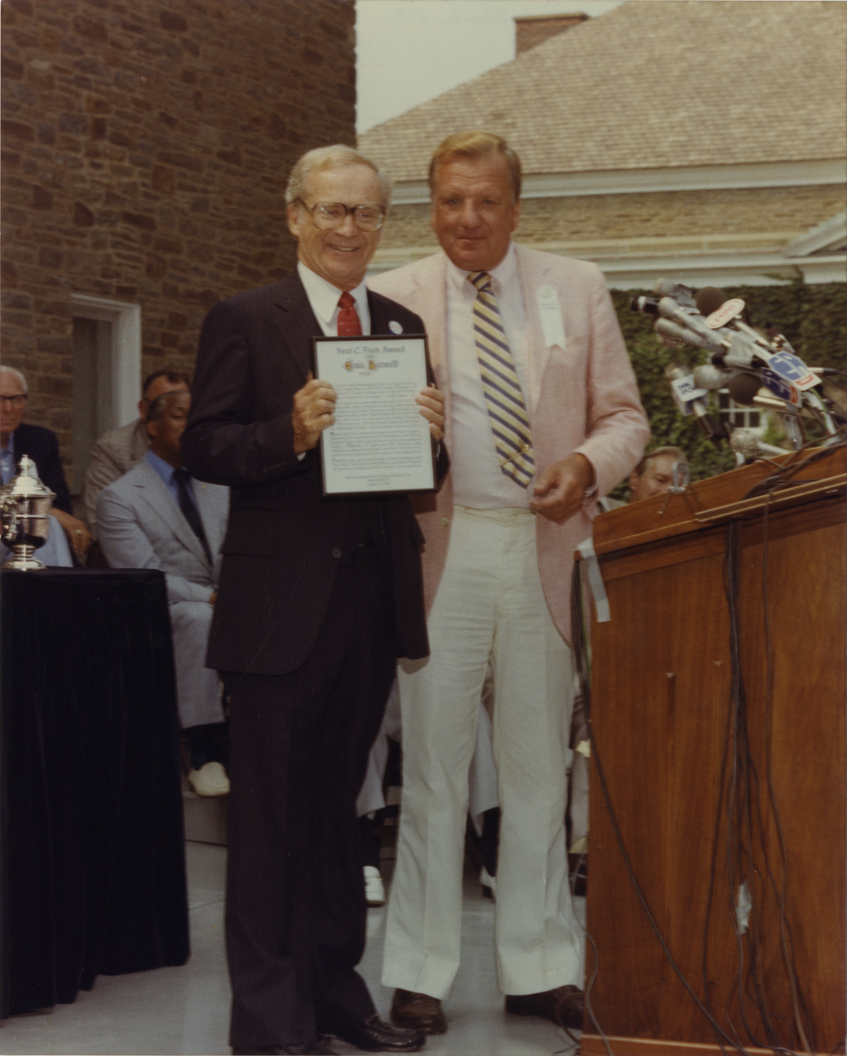 Favorite this☆ Ernie Harwell receiving Ford C. Frick Award Description: View of Ernie Harwell receiving the Ford C. Frick Award at the National Baseball Hall of Fame. Harwell, holding framed certificate, stands next to unidentified man at podium. Handwritten on back: "Hall of Fame, 1981." Details Resource ID: hr005348 Subject: Harwell, Ernie National Baseball Hall of Fame and Museum Baseball announcers--Awards Photographic prints Date Issued: 1981 Format: 1 photographic print : col. ; 10 x 8 in. Member of: Ernie Harwell Sports Collection Filing Location: Photographs-Harwell, Ernie-Hall of Fame, 1981 Rights: Physical rights are retained by DPL. Copyright is retained in accordance with U.S. copyright laws.
