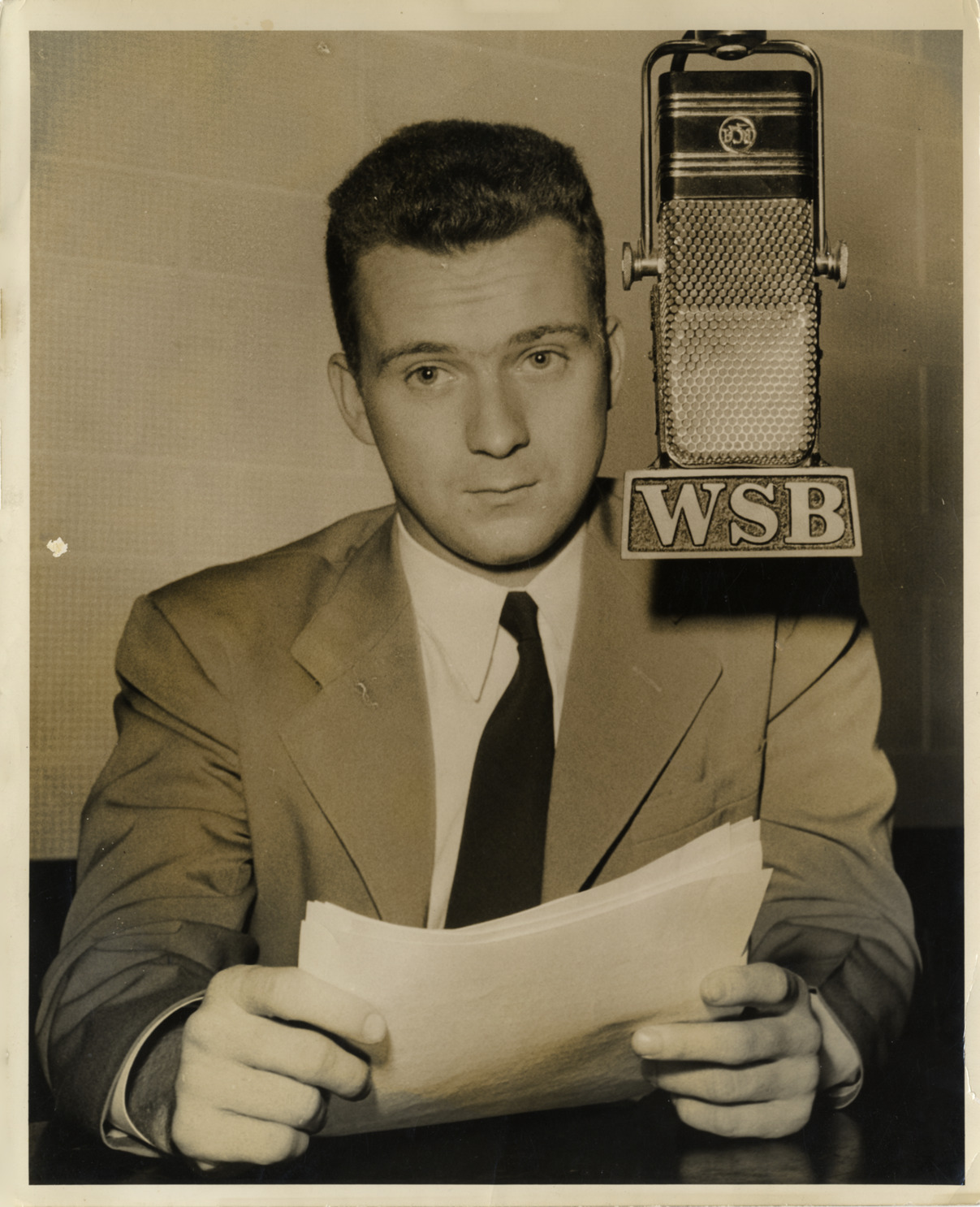 View of Ernie Harwell holding script in front of microphone at WSB radio Station in Atlanta, Georgia. Handwritten on back: "EH, 1942."