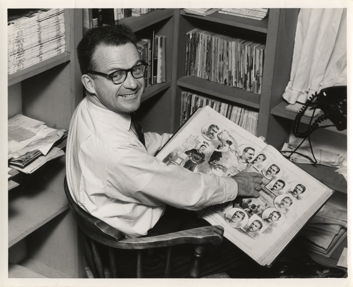 View of Ernie Harwell, in corner of office, examining a copy of the National Police Gazette. Stamped on back: "Photograph by James F. Lally. Baltimore News-Post." Handwritten on back: "Ernie Harwell with old bound volume of editions of the Police Gazette which is part of his vast collection."