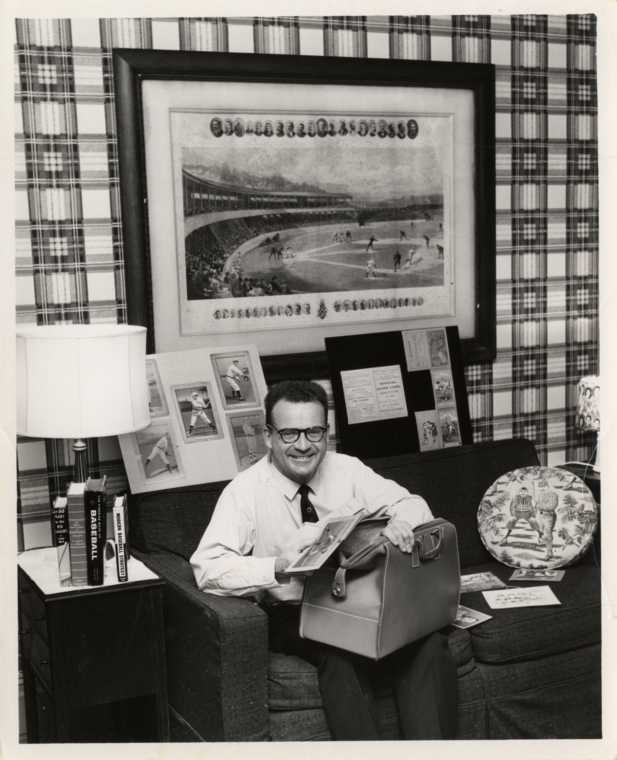 View of Ernie Harwell, sitting on sofa with open valise, surrounded by memorabilia from his collection. Stamped on back: "Photograph by James F. Lally. Baltimore News-Post." Handwritten on back: "Ernie Harwell in his den with some of his baseball trophies & souvenirs."