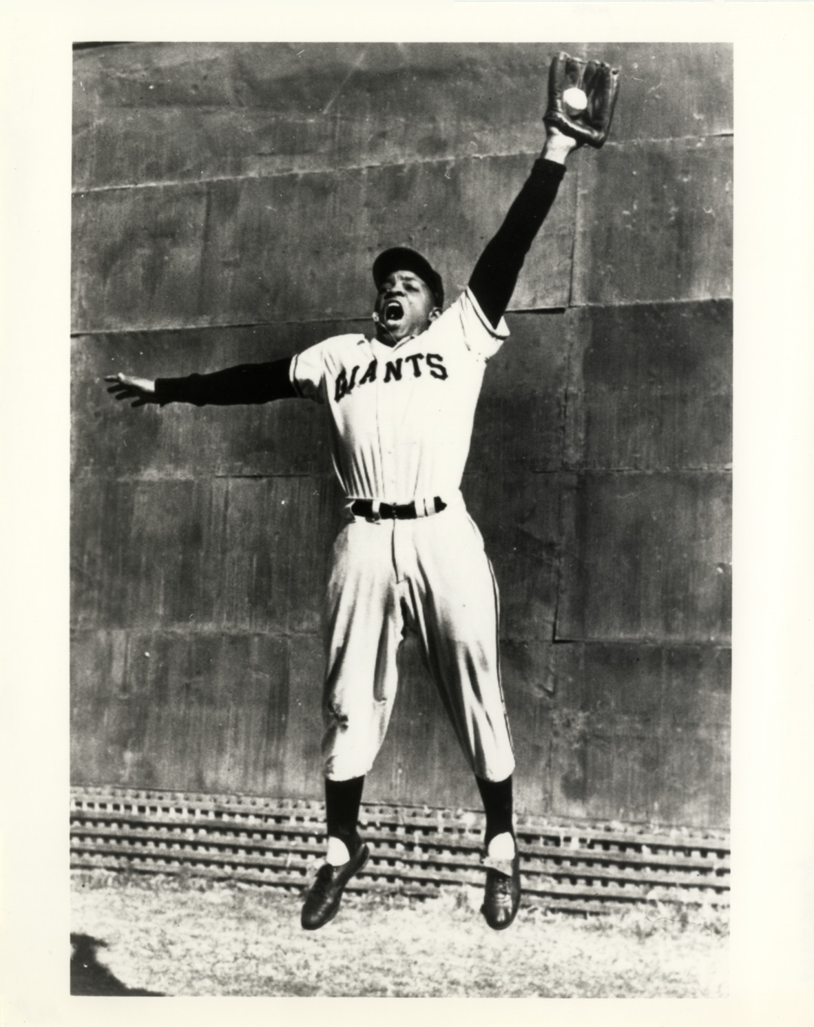 View of Willie Mays, baseball player for the New York Giants, catching a fly ball.