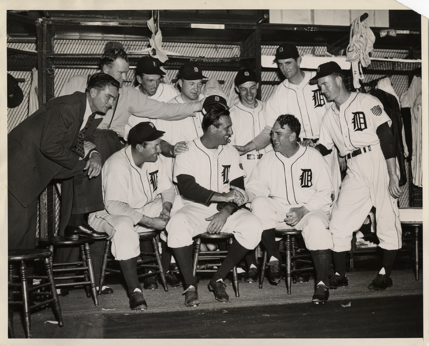 Favorite this☆ Hank Greenberg with Detroit Tigers baseball players in dugout Description: View of baseball player Hank Greenberg with Detroit Tigers baseball players in dugout. Handwritten on back: "Baseball, Detroit Tigers, 1945." Details Resource ID: hr005374 Subject: Greenberg, Hank (Henry Benjamin), 1911-1986 Baseball players--Michigan--Detroit Detroit Tigers (Baseball team) Photographic prints Date Issued: 1945 Format: 1 photographic print ; 8.25 x 10 in. Member of: Ernie Harwell Sports Collection Filing Location: Photographs-Teams-Tigers-1945 Rights: Physical rights are retained by DPL. Copyright is retained in accordance with U.S. copyright laws.