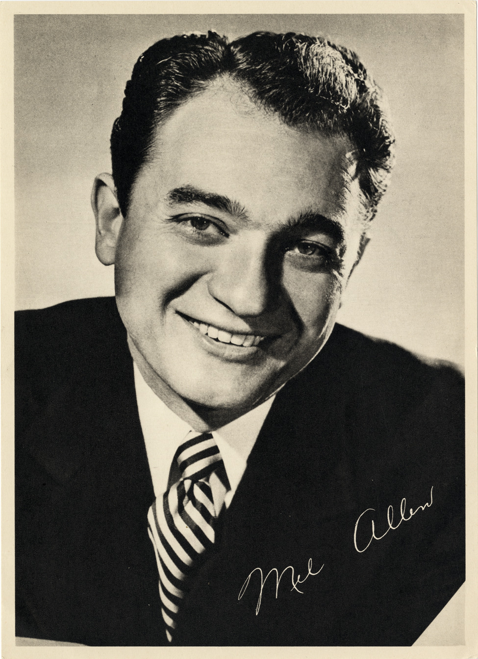Favorite this☆ Mel Allen Description: Portrait of announcer Mel Allen. Facsimile signature printed on front: "Mel Allen." Details Resource ID: hr005381 Subject: Allen, Mel, 1913-1996 Baseball announcers Photographic prints Date Issued: Unknown year Format: 1 photographic print ; 9 x 6.5 in. Member of: Ernie Harwell Sports Collection Filing Location: Photographs-Biography-Allen, Mel Rights: Physical rights are retained by DPL. Copyright is retained in accordance with U.S. copyright laws.