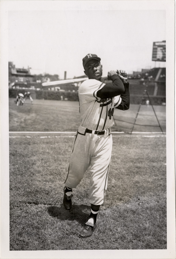 View of Hank Aaron, baseball player for the Milwaukee Braves, swinging a baseball bat. Stamped on back: "Geo. Brace, 2638 No. Drake Ave., Chicago 47, Ill." Handwritten on back: "Aaron, Henry."