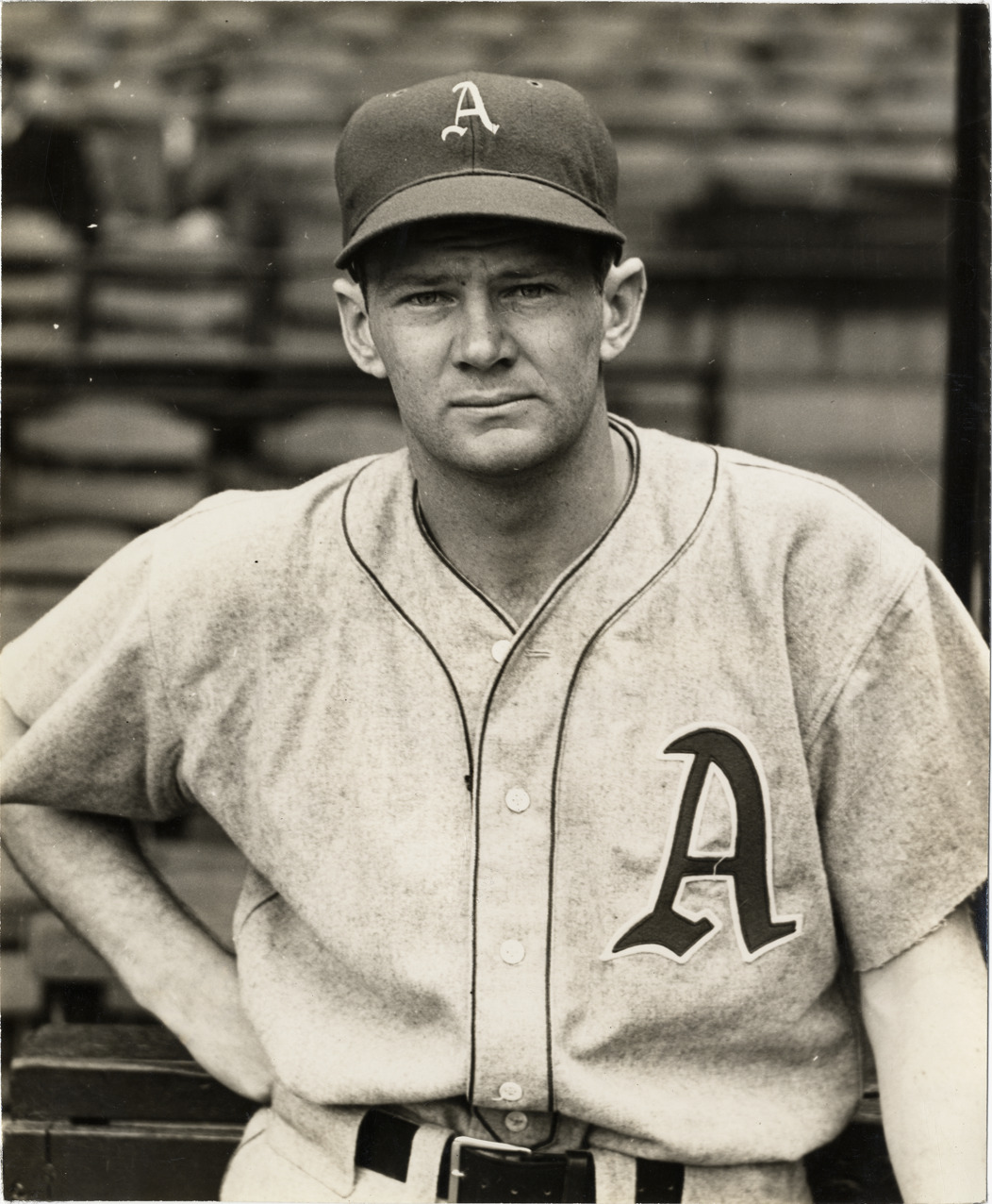 Portrait of Wayne Ambler, baseball player for the Philadelphia Athletics. Handwritten on back: "Wayne Ambler, Athletics, 1938."
