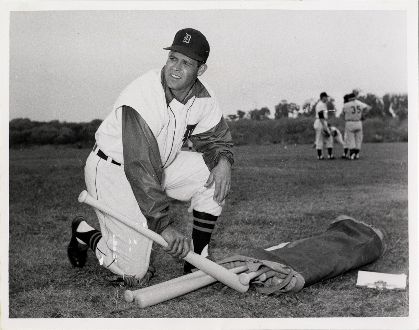 View of Ray Boone, baseball player for the Detroit Tigers, crouching next to bag of baseball bats. Handwritten on back: "Ray Boone."