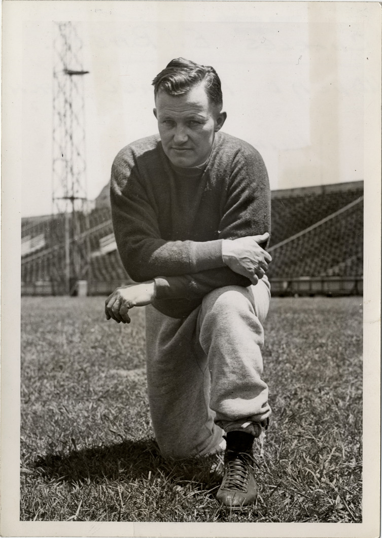 View of Chuck Baer, football coach for the University of Detroit. Stamped on back: "University of Detroit, Publicity Department, Detroit 21, Michigan." Handwritten on back: "Charles E. Baer. UD head football coach. Illinois '29. 39 yrs. old. Married, has two sons, Chuckie, 12, Robert, 3."
