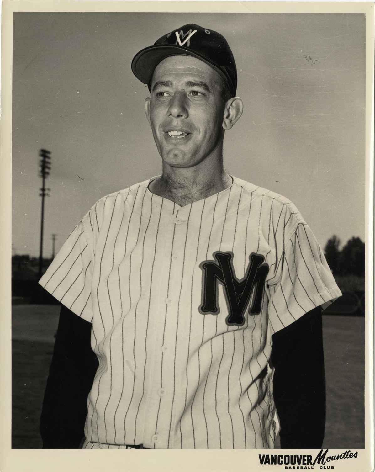 Portrait of George Bamberger, pitcher for the Vancouver Mounties. Printed on front: "Vancouver Mounties baseball club." Stamped on back: "Photo by Graphic Industries Ltd., File no. 3304, Vancouver, Canada. Pacific 4174." Handwritten on back: "George Bamberger, age 33, 5-11, 175, bats & throws R."