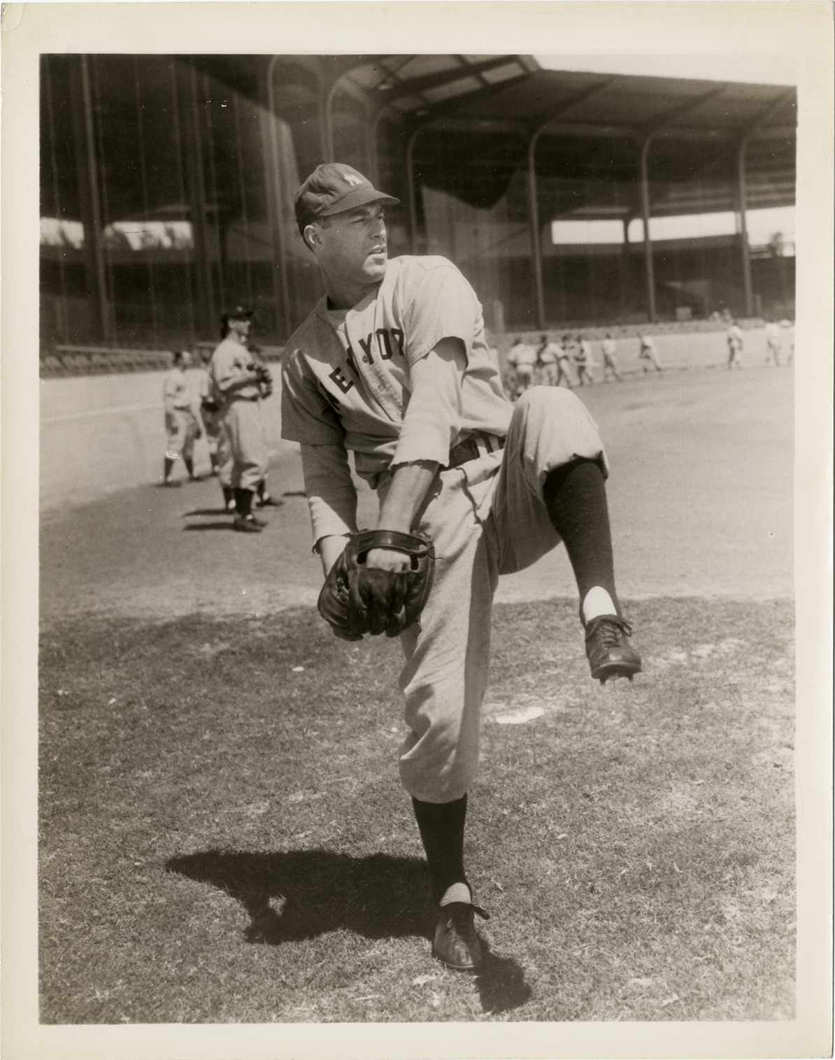 View of Bill Bevens, pitcher for the New York Yankees. Grandstand in background. Handwritten on back: "Floyd Bevens, RHP, Yankees."