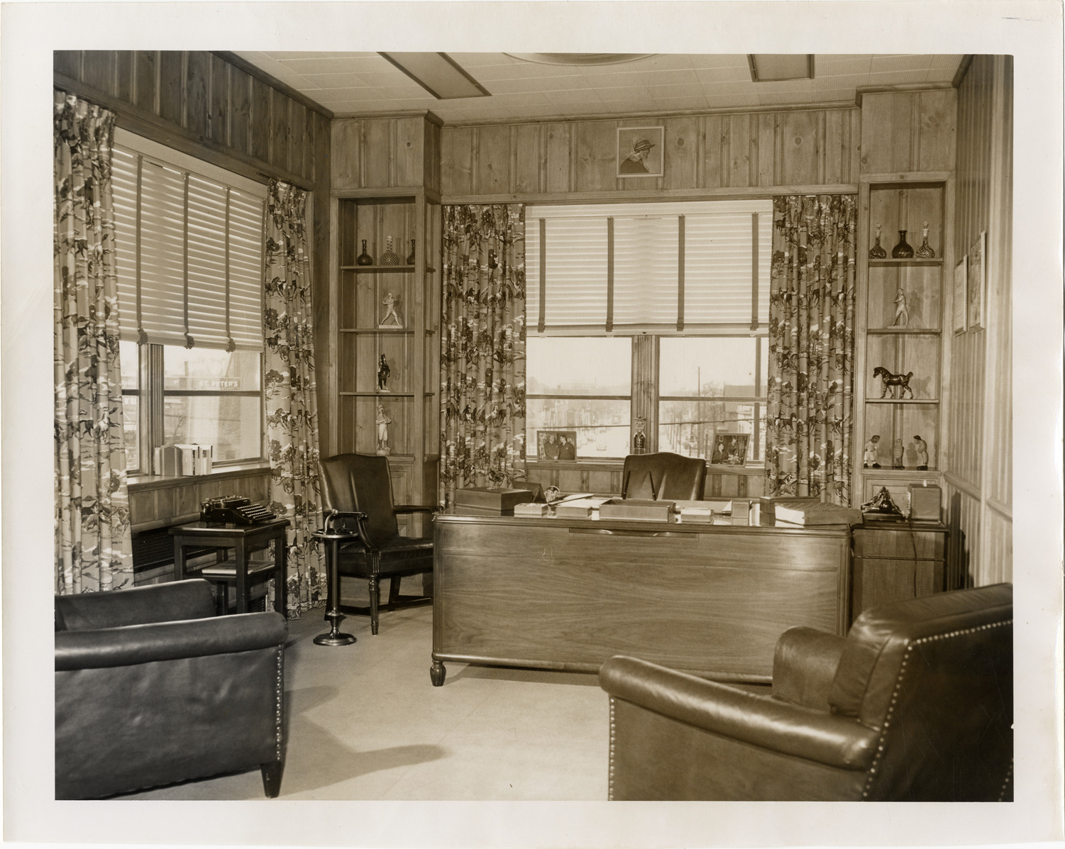 Favorite this☆ Office of Walter O. Briggs Description: View of the office of Walter O. Briggs, owner of the Detroit Tigers. Room is furnished with desk, armchairs and shelves. Typewriter and ashtray on left; curtained windows in background. Handwritten on back: "Office, W.O. Briggs." Details Resource ID: hr005592 Subject: Briggs, Walter O., 1877-1952 Offices--Michigan--Detroit Office furniture--Michigan--Detroit Desks--Michigan--Detroit Photographic prints Date Issued: Unknown year Format: 1 photographic print ; 8 x 10 in. Member of: Ernie Harwell Sports Collection Filing Location: Photographs-Biography-Briggs, Walter O. Rights: Physical rights are retained by DPL. Copyright is retained in accordance with U.S. copyright laws.