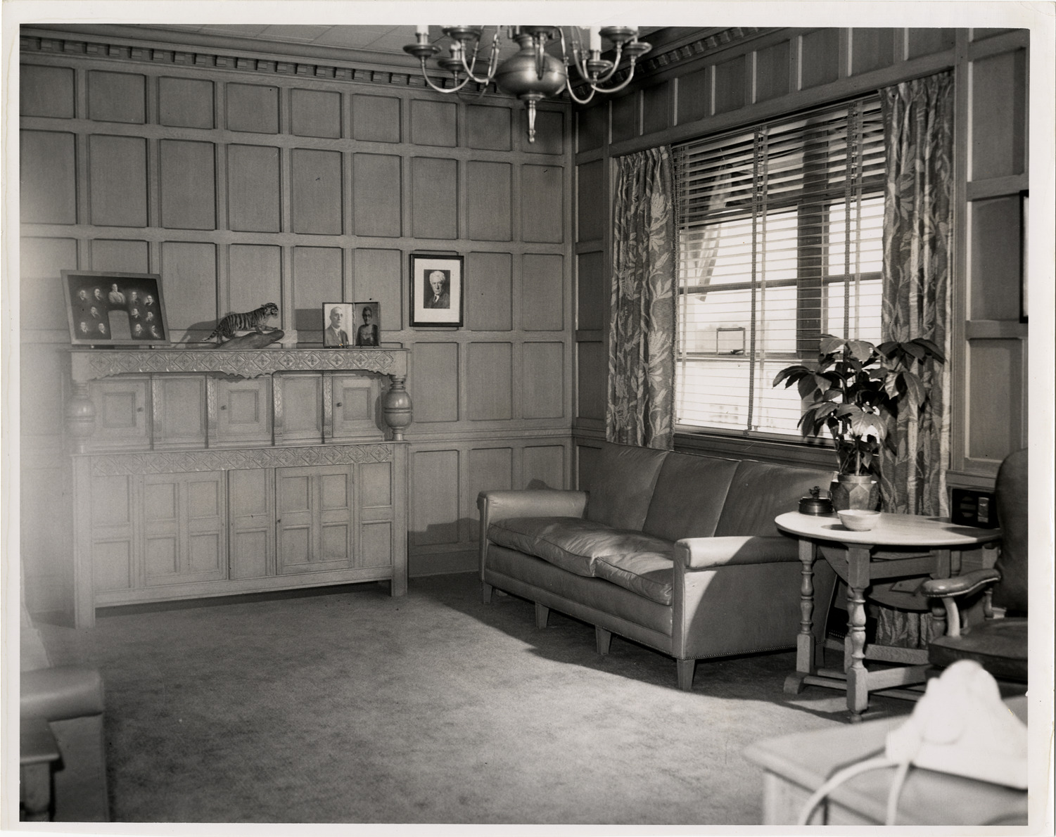 View of a corner of the office of Walter O. Briggs, owner of the Detroit Tigers. Room is furnished with sofa, side table and cabinet. Statue of tiger and framed portraits are displayed on top of cabinet. Framed portrait of baseball commissioner Kennesaw Mountain Landis is displayed on wall. Curtained window in background. Handwritten on back: "Office, W.O. Briggs."