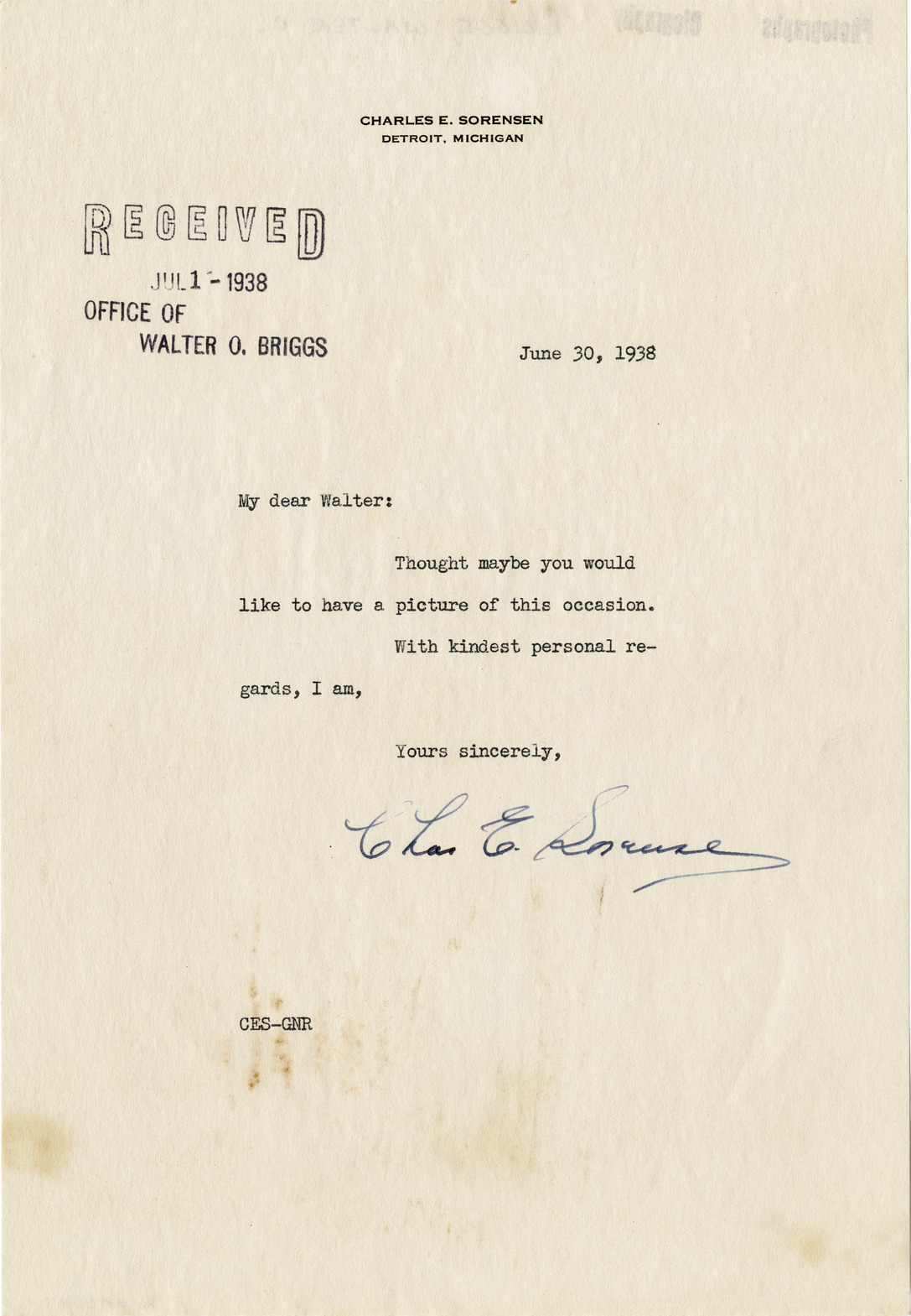 Letter to Walter O. Briggs, owner of the Detroit Tigers, from Charles E. Sorensen of the Ford Motor Company. Transcript of letter: "June 30, 1938. My dear Walter: Thought maybe you would like to have a picture of this occasion. With kindest personal regards, I am, Yours sincerely, Chas. E. Sorensen. CES-GNR." Printed on front: "Charles E. Sorensen, Detroit, Michigan." Stamped on front: "Received Jul 1, 1938. Office of Walter O. Briggs."