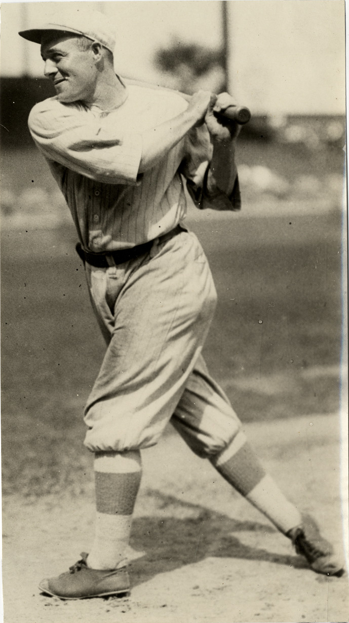 View of George J. Burns, baseball player for the New York Giants, holding a baseball bat. Stamped on back: "Charles M. Conlon, 348 West 188th St., New York." Handwritten on back: "Burns, Giants."