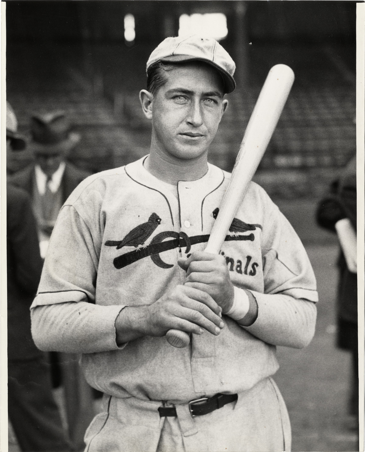 Favorite this☆ Bill Delancey Description: Portrait of Bill DeLancey, catcher for the St. Louis Cardinals, holding a baseball bat. Handwritten on back: "Bill DeLancey." Details Resource ID: hr005800 Subject: DeLancey, Bill (William Pinkney), 1911-1946 Catchers (Baseball)--Missouri--Saint Louis St. Louis Cardinals (Baseball team) Photographic prints Date Issued: 1932 to 1940 Format: 1 photographic print ; 10 x 8 in. Member of: Ernie Harwell Sports Collection Filing Location: Photographs-Biography-DeLancey, Bill Rights: Physical rights are retained by DPL. Copyright is retained in accordance with U.S. copyright laws.