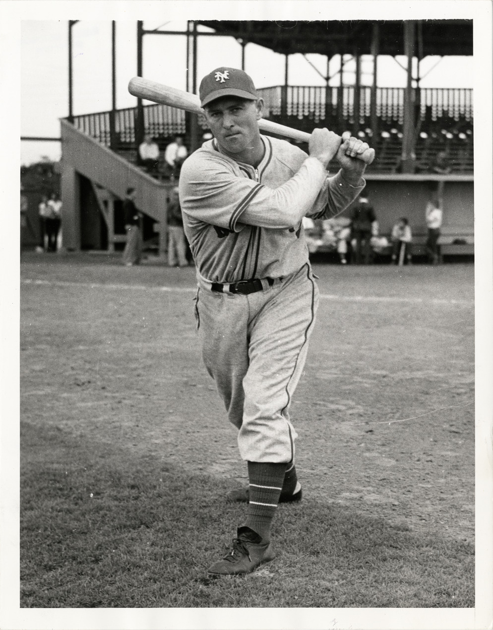 Portrait of Frank Demaree, baseball player for the New York Giants, holding a baseball bat. Handwritten on back: "Frank Demaree, N.Y. Giant's l.f., 1940."