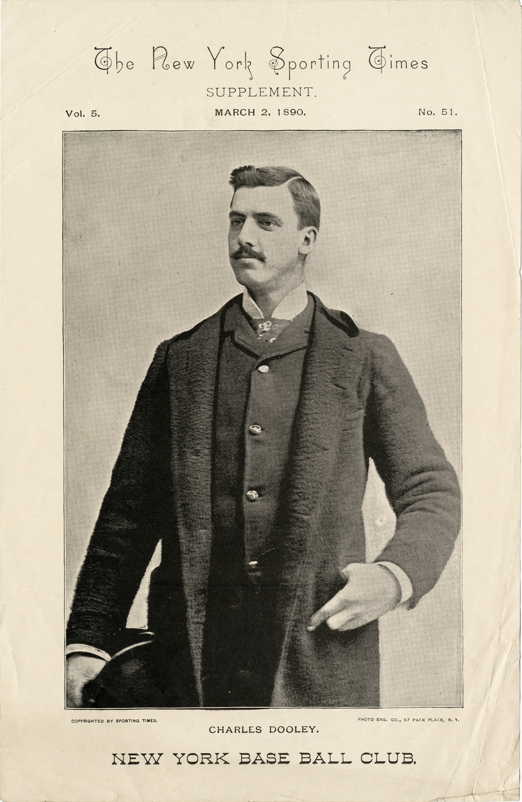 Favorite this☆ Charles Dooley Description: Portrait of baseball player Charles Dooley. Printed on front: The New York Sporting Times, Supplement, vol. 5, no. 51, March 2, 1890. Charles Dooley, New York base ball club. Copyrighted by Sporting Times. Photo Eng. Co., 67 Park Place, N.Y." Details Resource ID: hr005820 Subject: Dooley, Charles Baseball players--New York (State)--New York Baseball teams--New York (State)--New York Clippings (Books, newspapers, etc.) Note (Source): New York Sporting Times Date Issued: 1890-03-02 Format: 1 clipping ; 11 x 7.25 in. Member of: Ernie Harwell Sports Collection Filing Location: Photographs-Biography-Dooley, Charles Rights: Physical rights are retained by DPL. Copyright is retained in accordance with U.S. copyright laws.