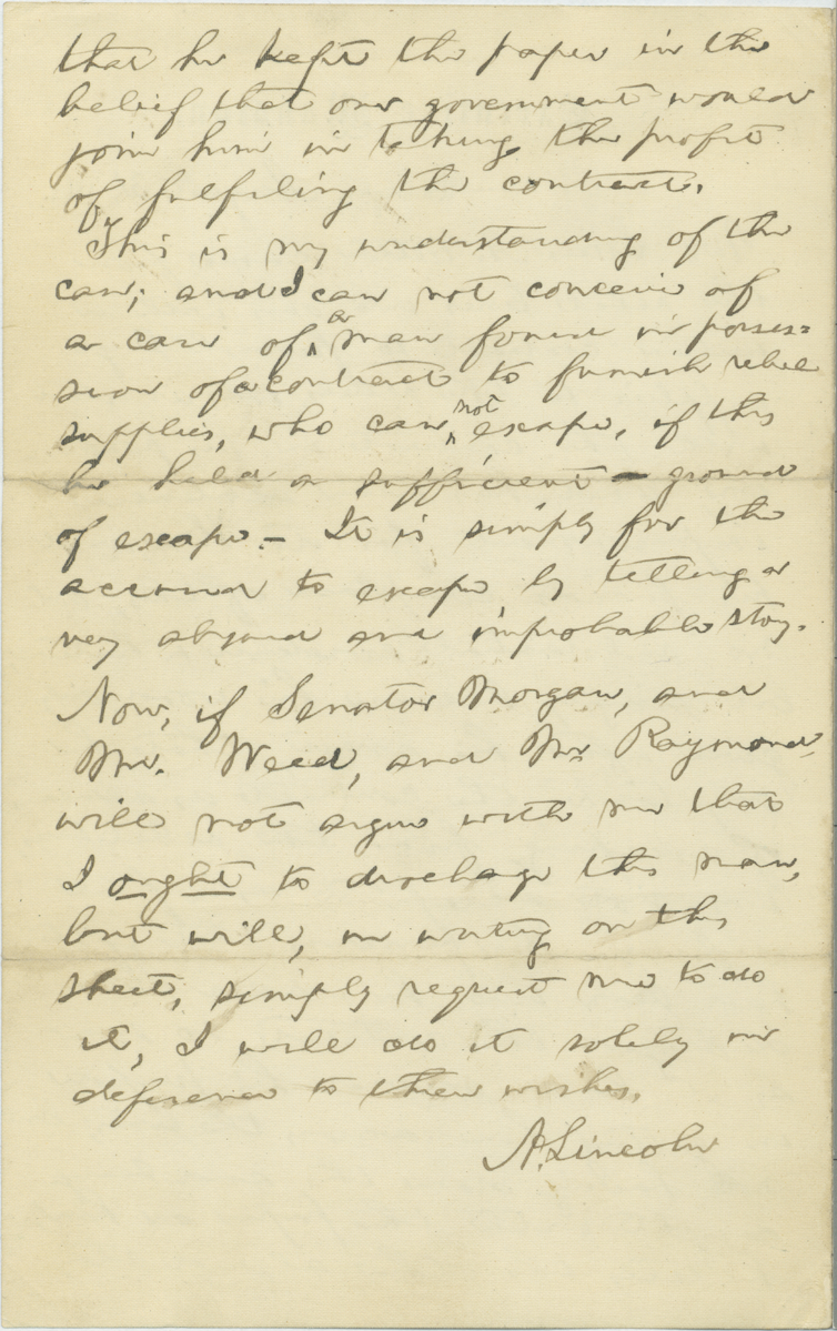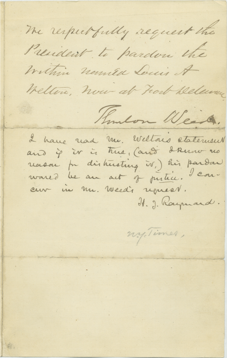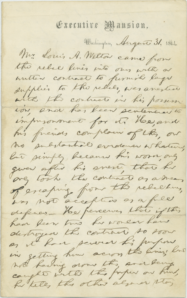 Transcript of page 1: "Executive Mansion, Washington, August 31, 1864. Mr. Louis A. Welton came from the rebel lines into ours with a written contract to furnish large supplies to the rebels, was arrested with the contract in his possession, and has been sentenced to imprisonment for it. He, and his friends complain of this, on no substantial evidence whatever, but simply because his word, only given after his arrest, that he only took the contract as a means of escaping from the rebel lines, was not accepted as a full defense. He perceives that if this had been true he would have destroyed the contract so soon as it had served his purpose in getting him across the lines; but not having done this and being caught with the paper on him, he tells this other absurd story" Transcript of page 2: "that he kept the paper in the belief that our government would join him in taking the profit of fulfiling the contract. This is my understanding of the case; and I can not conceive of a case of a man found in possession of a contract to furnish rebel supplies, who can not escape, if this be held a sufficient ground of escape. It is simply for the accused to escape by telling a very absurd and improbable story. Now, if Senator Morgan, and Mr. Weed, and Mr. Raymond, will not argue with me that I ought to discharge this man but will, in writing on this sheet, simply request me to do it, I will do it solely in deference to their wishes. A. Lincoln." Transcript of page 3: "We respectfully request the President to pardon the within named Louis A. Welton, now at Fort Delaware. Thurlow Weed. I have read Mr. Welton's statement and if it is true, (and I know no reason for distrusting it,) his pardon would be an act of justice. I concur in Mr. Weed's request. H.J. Raymond."